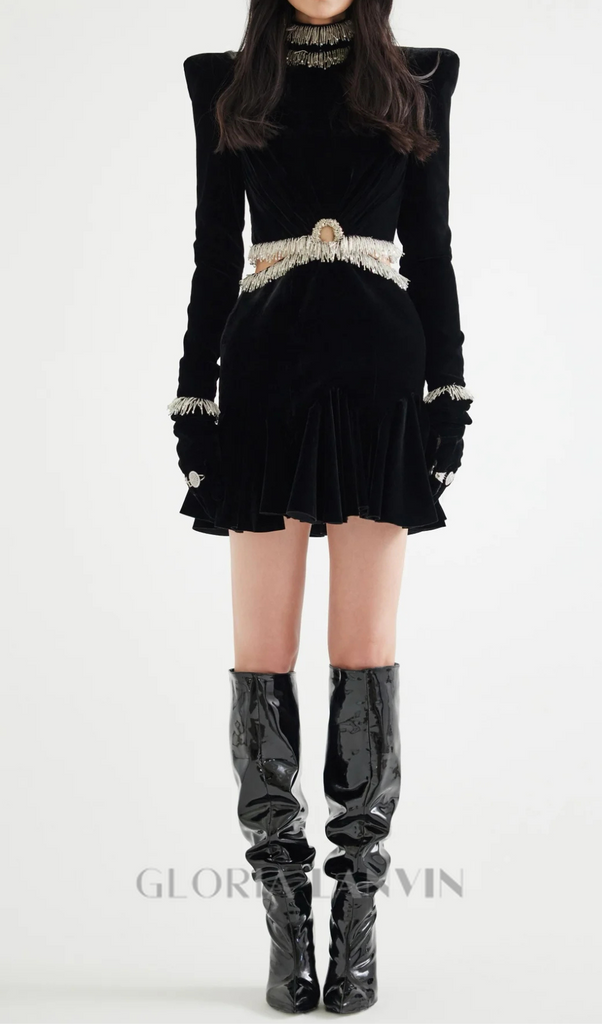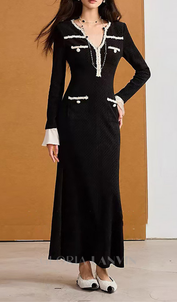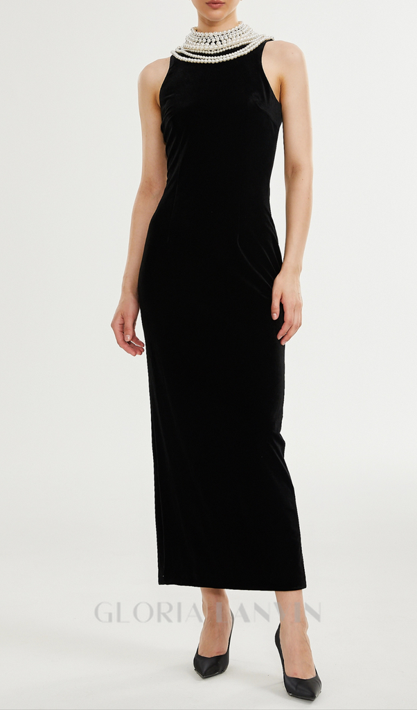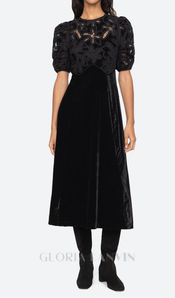 Robe midi Pandora noire en velours à manches longues, ornée de dentelle et de perles
