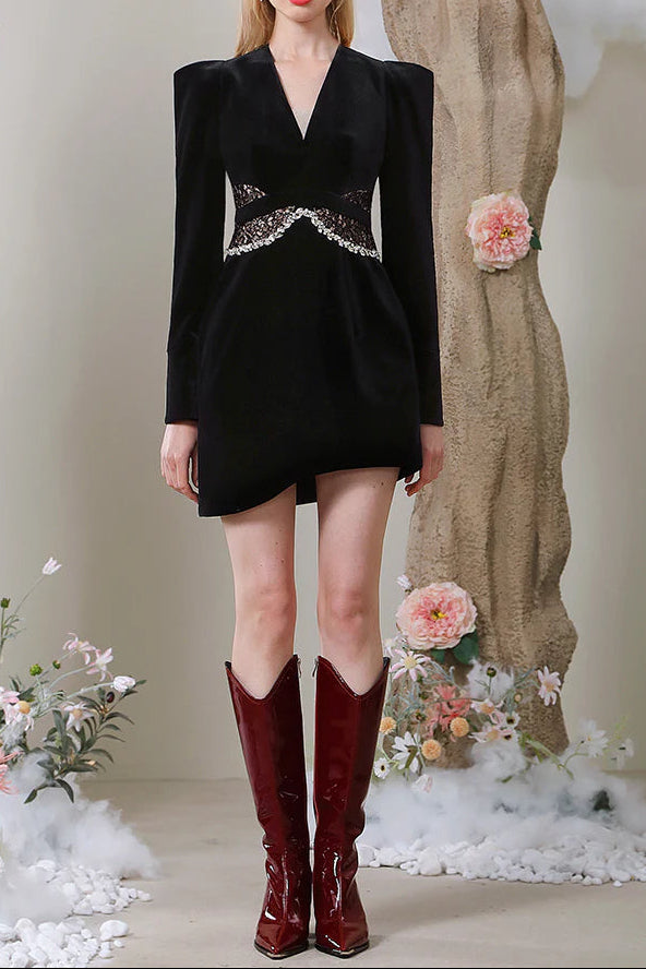 Robe blazer courte asymétrique en dentelle noire à col en V Quintana