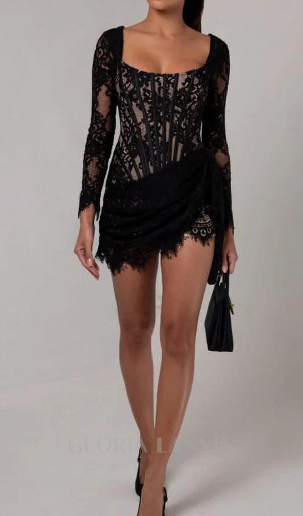 Robe mini drapée à corset en dentelle à manches longues noire
