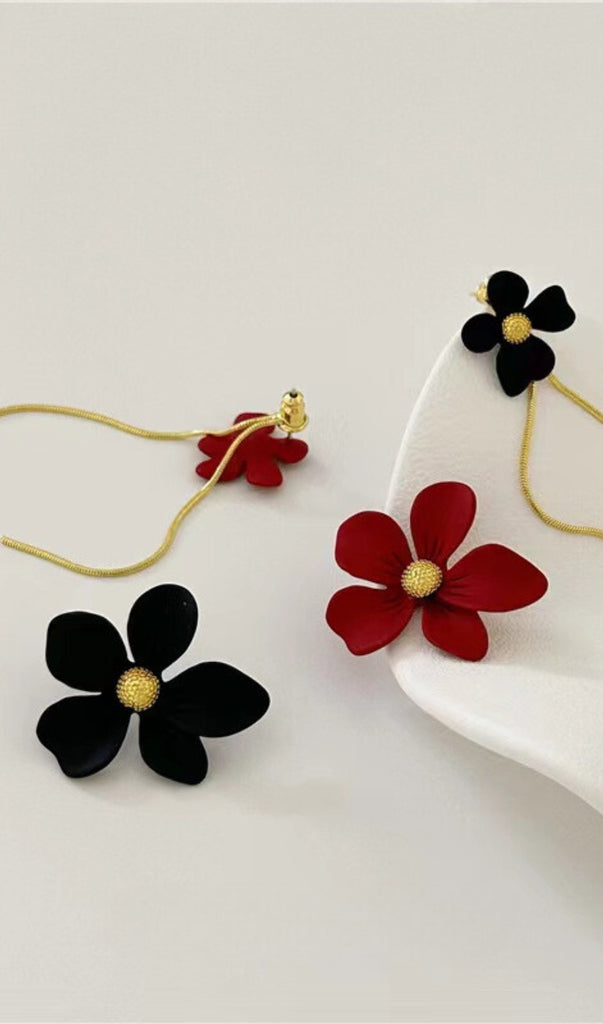 BOUCLES D'OREILLES FLEURS ASYMÉTRIQUES À GLANDS EN ROUGE