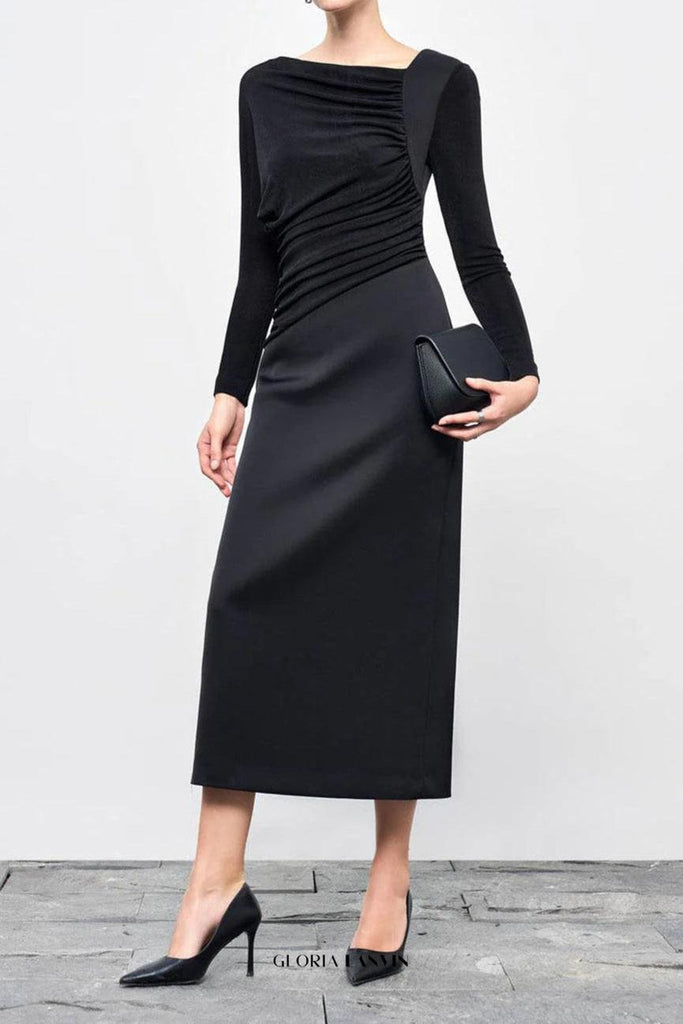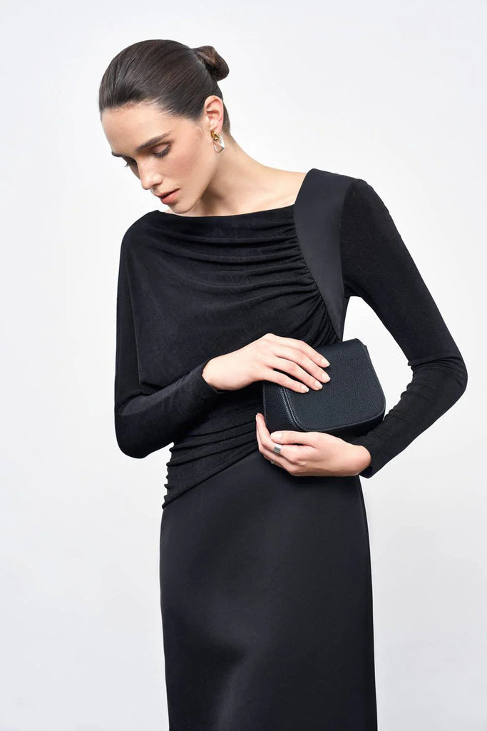 Confectionnée avec soin dans un taffetas de haute qualité, la robe midi Mirabel noire à fente dos nu respire l'élégance et le raffinement. Sa coupe trapèze classique et sa fente dos mettent en valeur toutes les silhouettes et offrent une grande liberté de mouvement. Parfaite pour les occasions formelles, cette robe est un incontournable pour toute personne à la pointe de la mode.