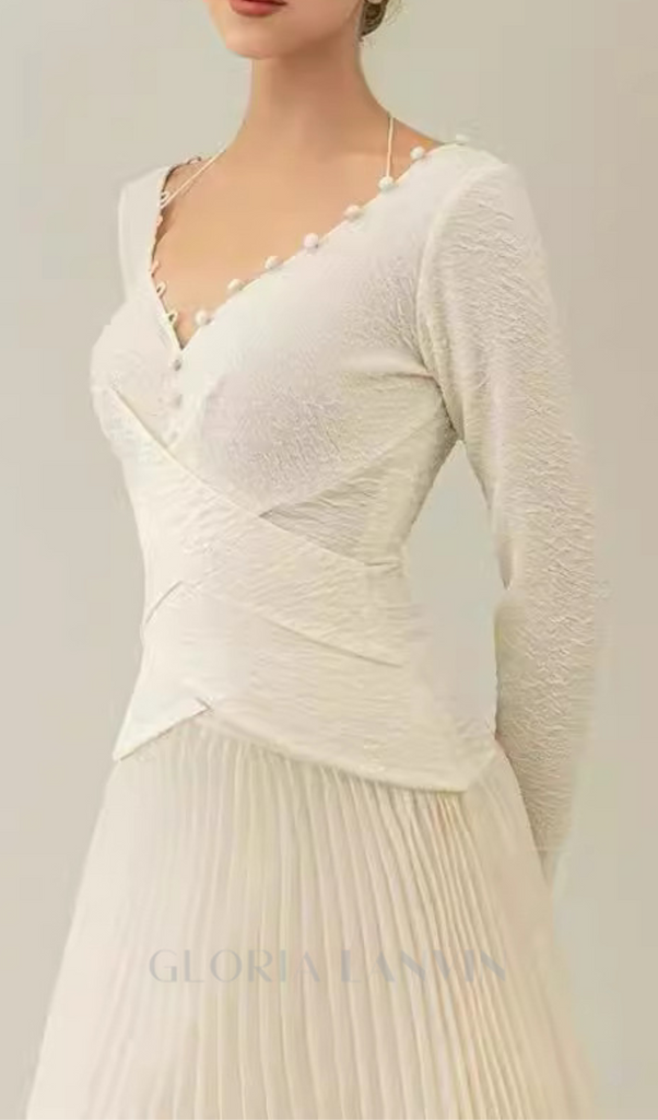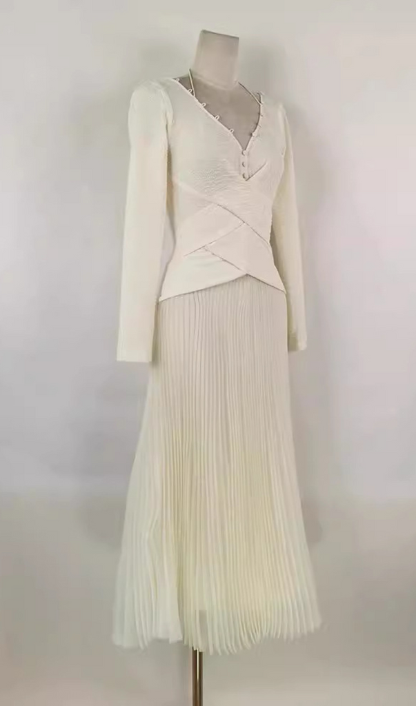 Notre robe longue plissée ivoire à col V est le choix idéal. Le col V flatte et allonge la silhouette, tandis que les plis apportent texture et mouvement. Parfaite pour toutes les occasions, cette robe vous assure une allure chic et élégante sans effort.