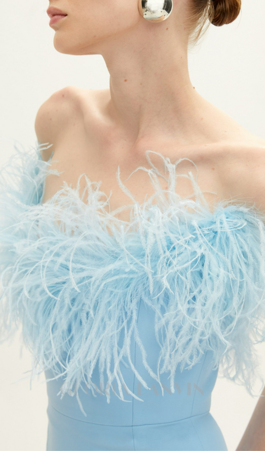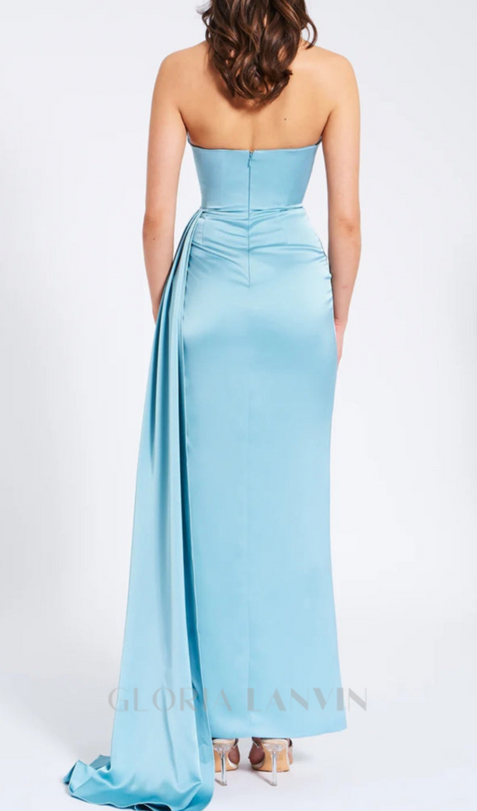 ROBE FENTE HAUTE ORNÉE DE CRISTAUX DE SATIN BLEU