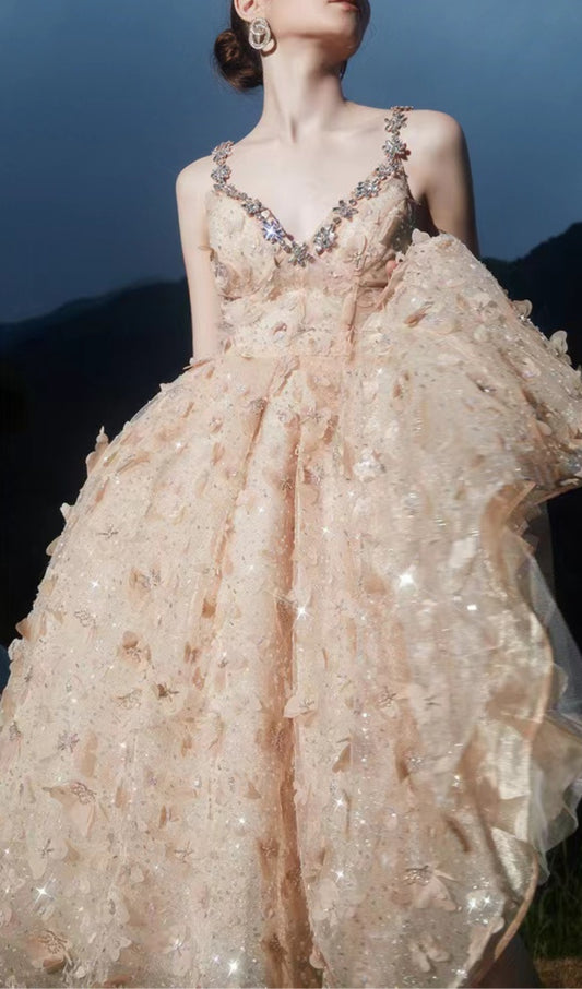 ROBE MIDI STÉRÉOSCOPIQUE EN MAILLE À SEQUINS PAPILLON EN CHAMPAGNE