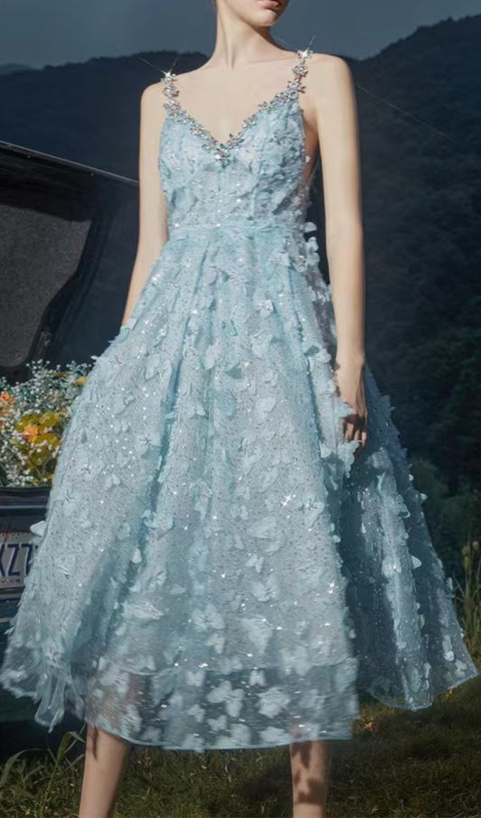 ROBE MIDI EN MAILLE À SEQUINS PAPILLON STÉRÉOSCOPIQUE BLEU
