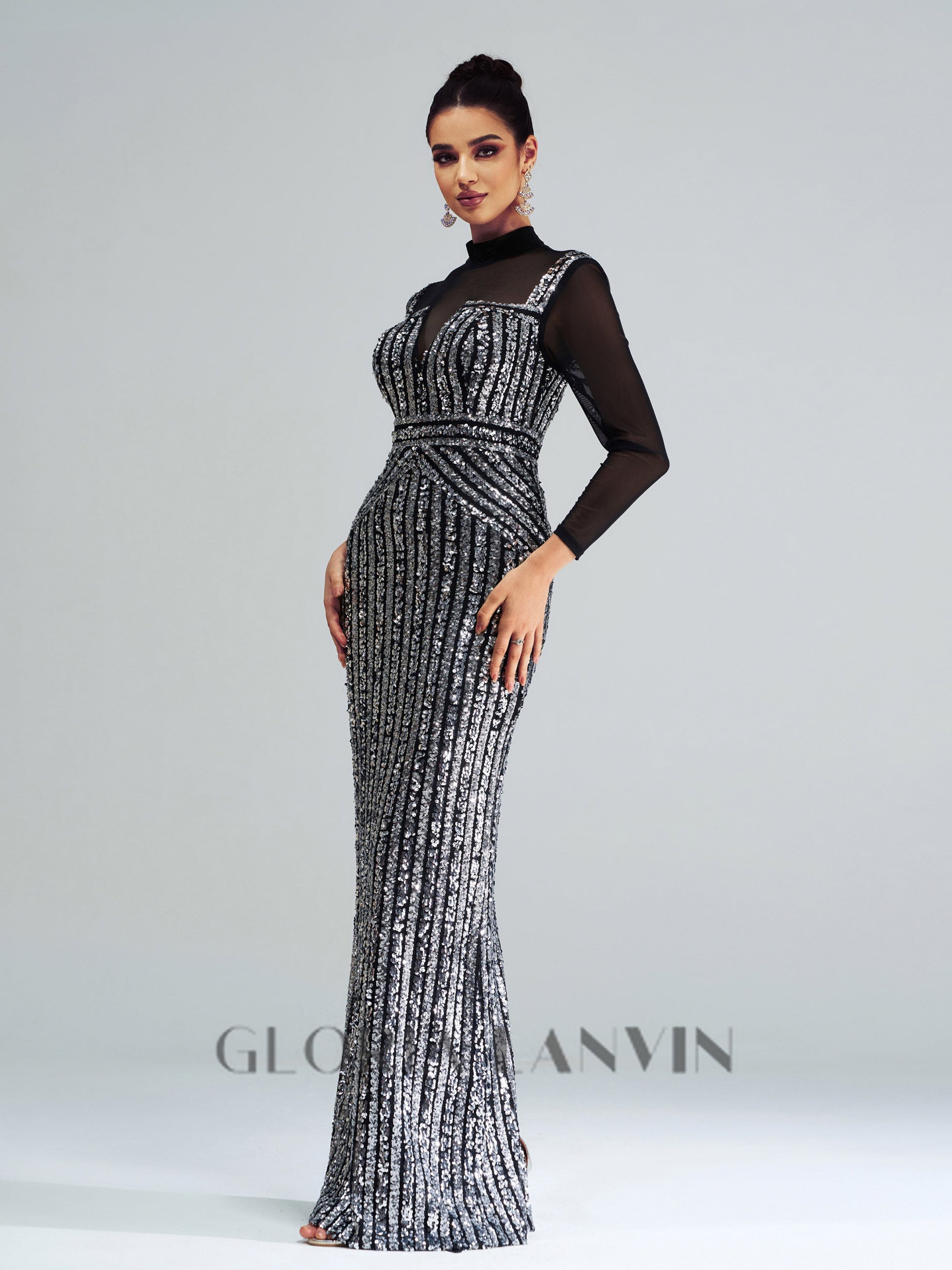Robe longue noire à col montant et empiècements de sequins