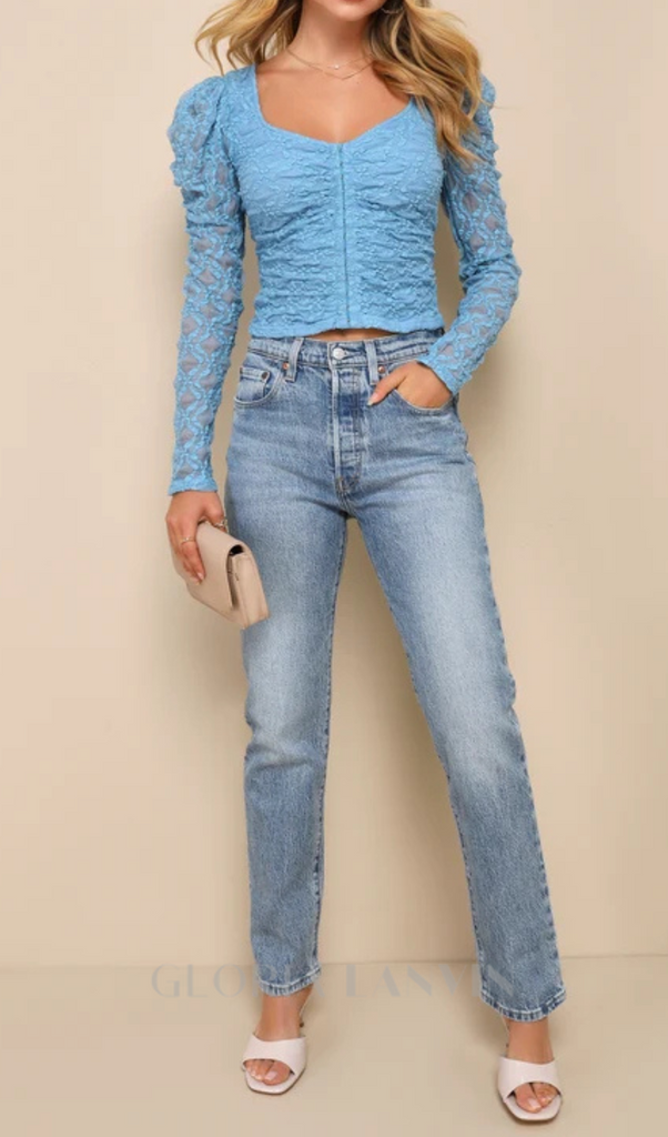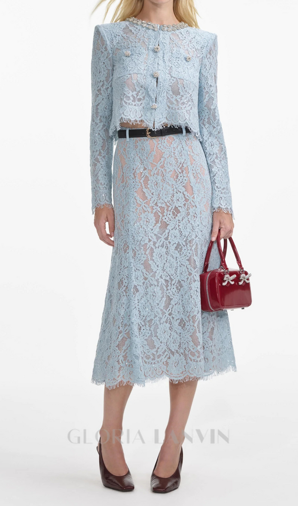 Ensemble haut et jupe midi bleu orné de dentelle Carol