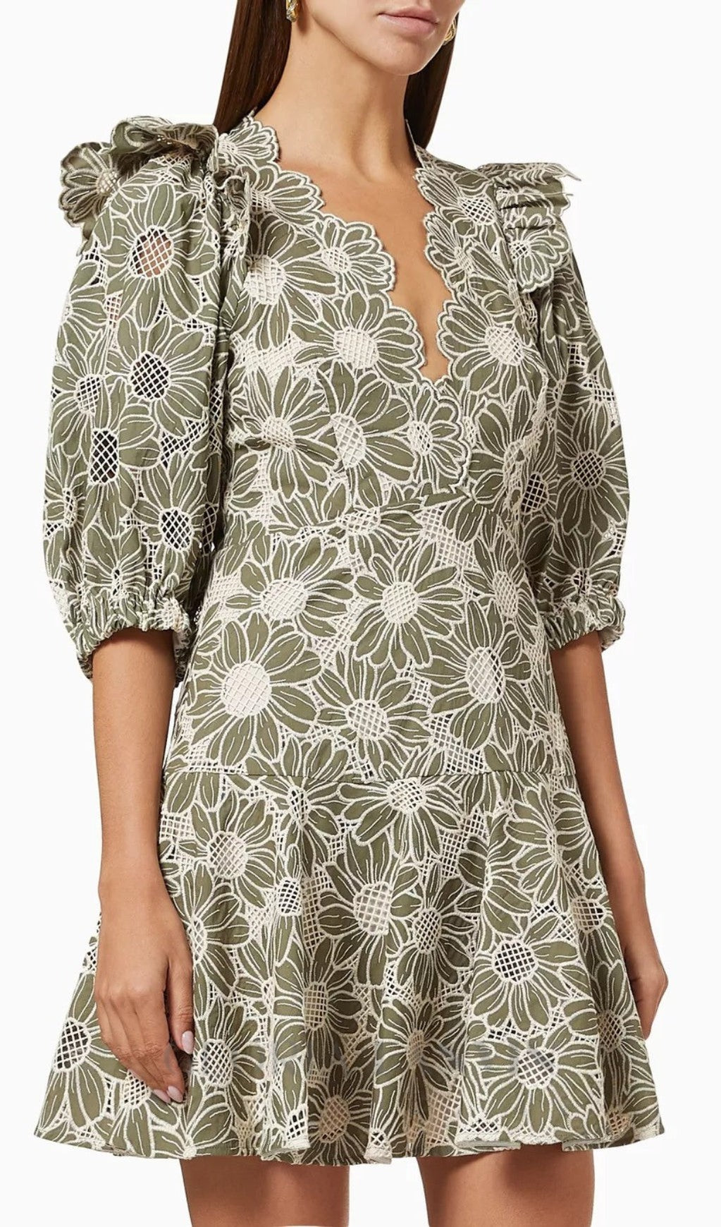 Add a feminine feel to the new-season wardrobe with this mini dress. Crafted in floral crochet, it features a flattering flared shape with a plunging neckline and puff sleeves. Add strappy sandals and a small bag for a contemporary finish.