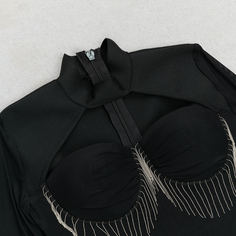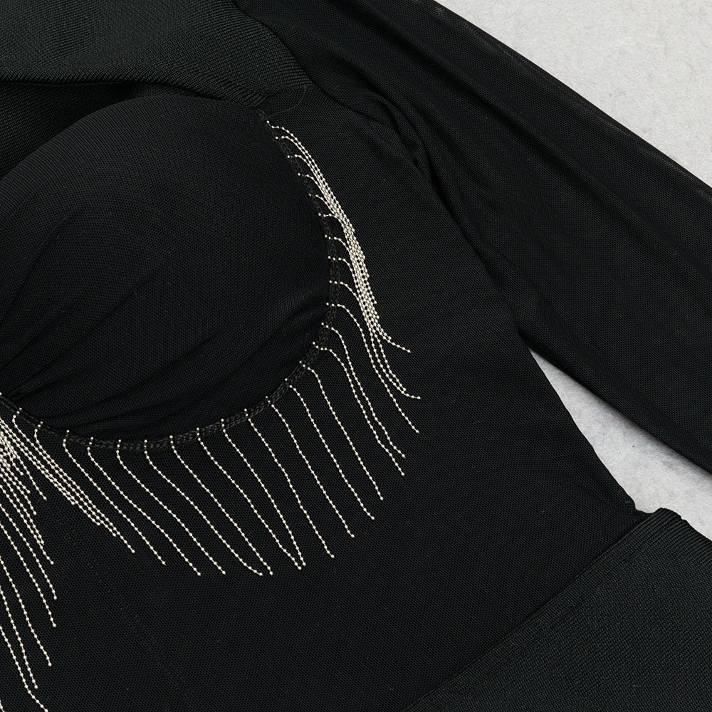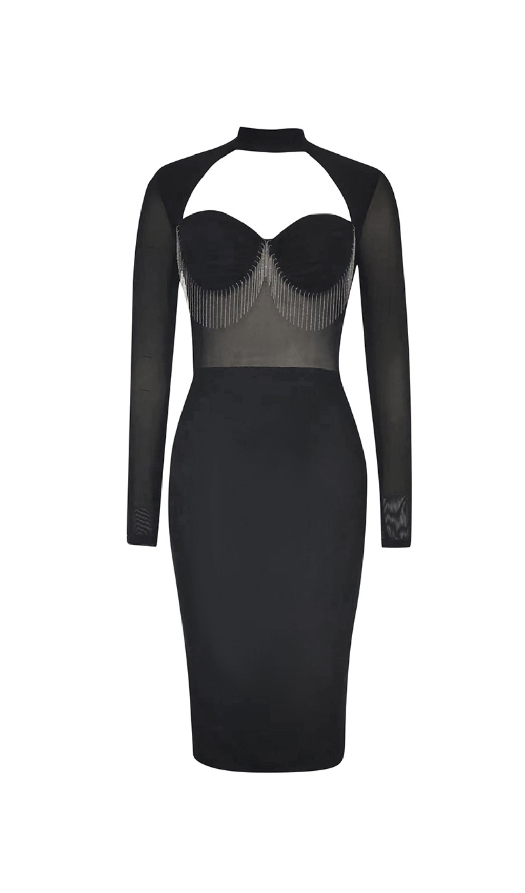 The unique cut out design and mesh fabric create a stunning silhouette, while the sleek black color adds a touch of sophistication. Make a statement and turn heads at any event with this must-have dress!