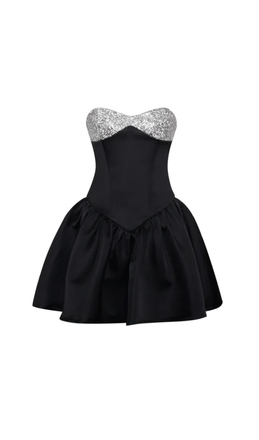 BLACK SATIN CRYSTAL BUSTIER A-LINE MINI DRESS