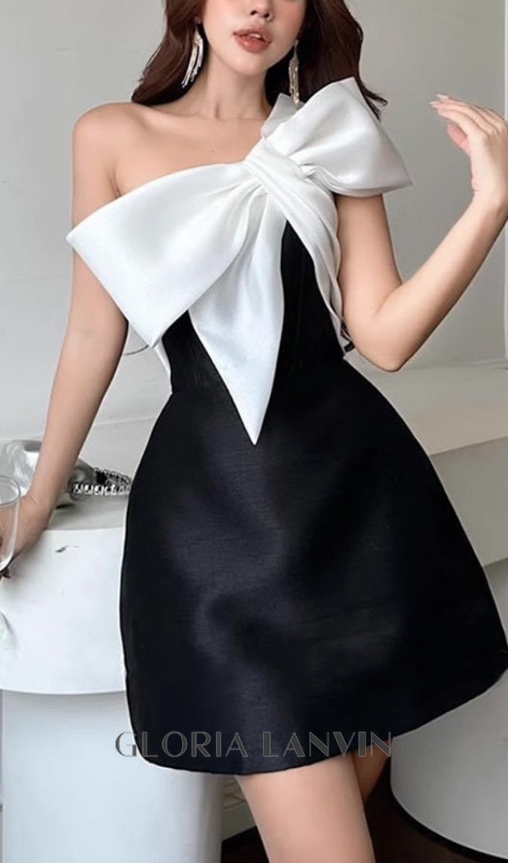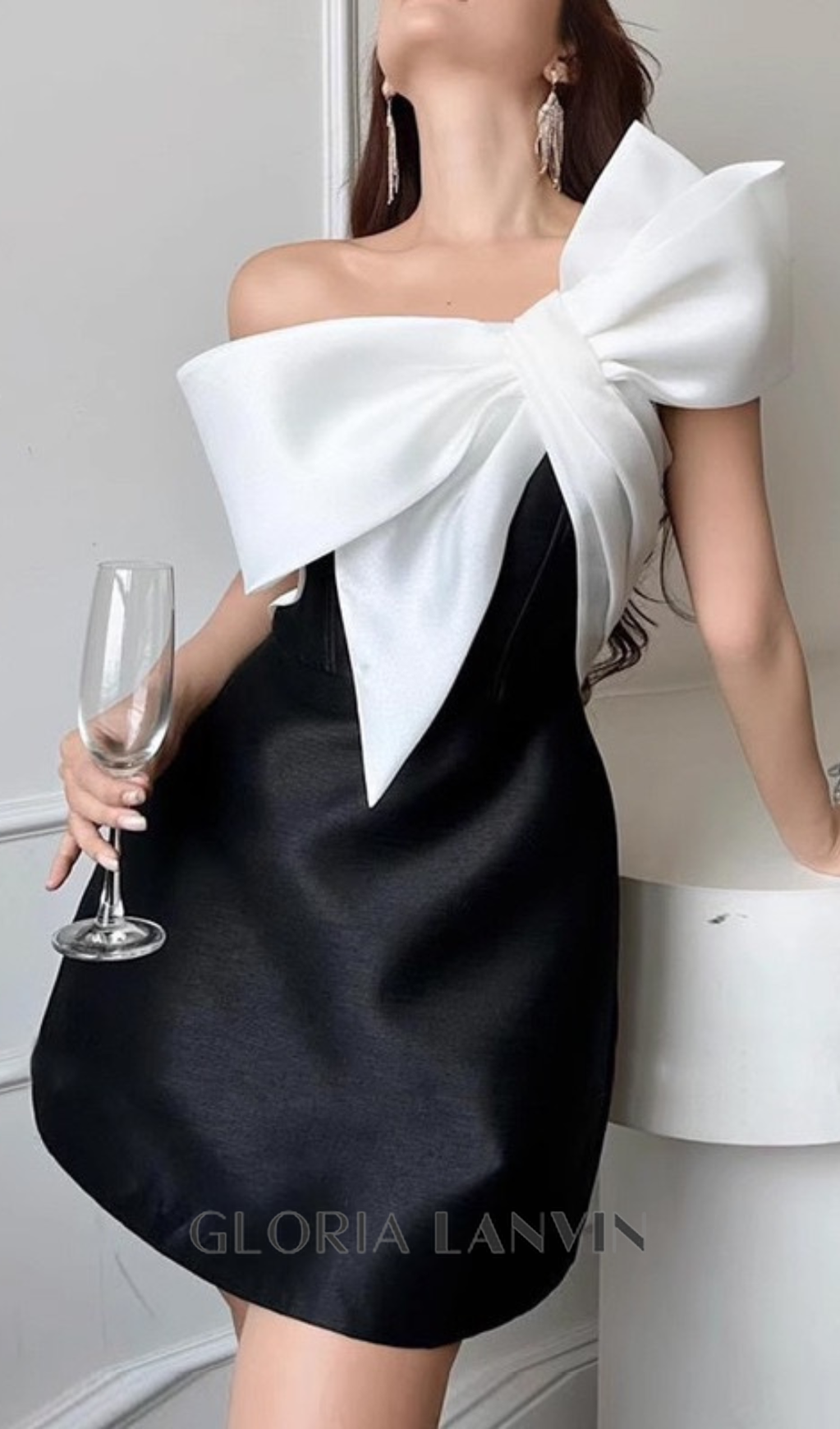 This daring dress features a unique bow-tie design and an off-shoulder neckline, creating a chic and eye-catching look. Perfect for those who love to stand out and take risks in their style. Elevate your wardrobe with this must-have dress!