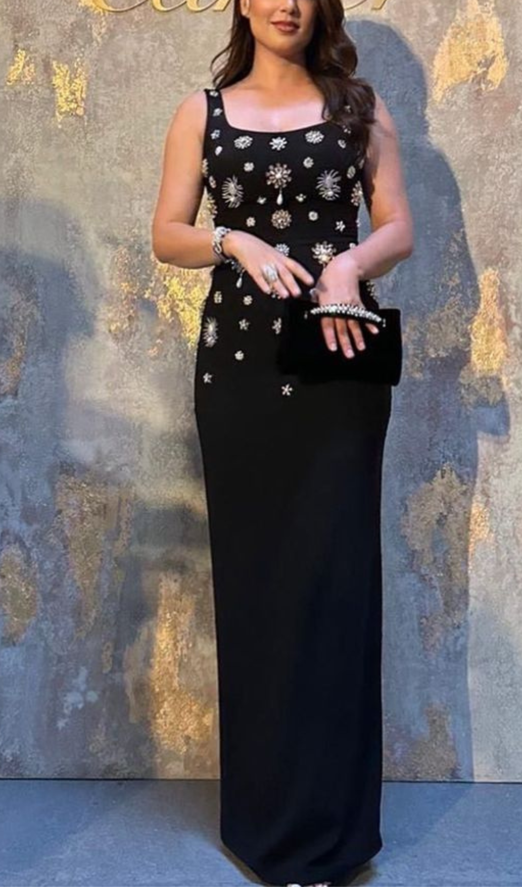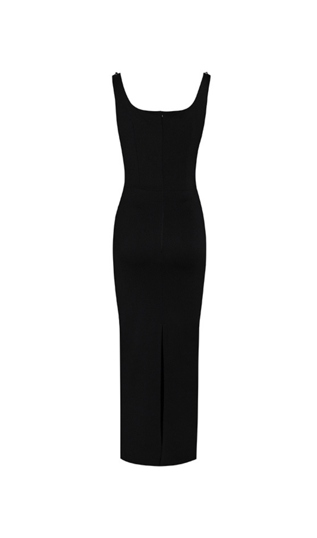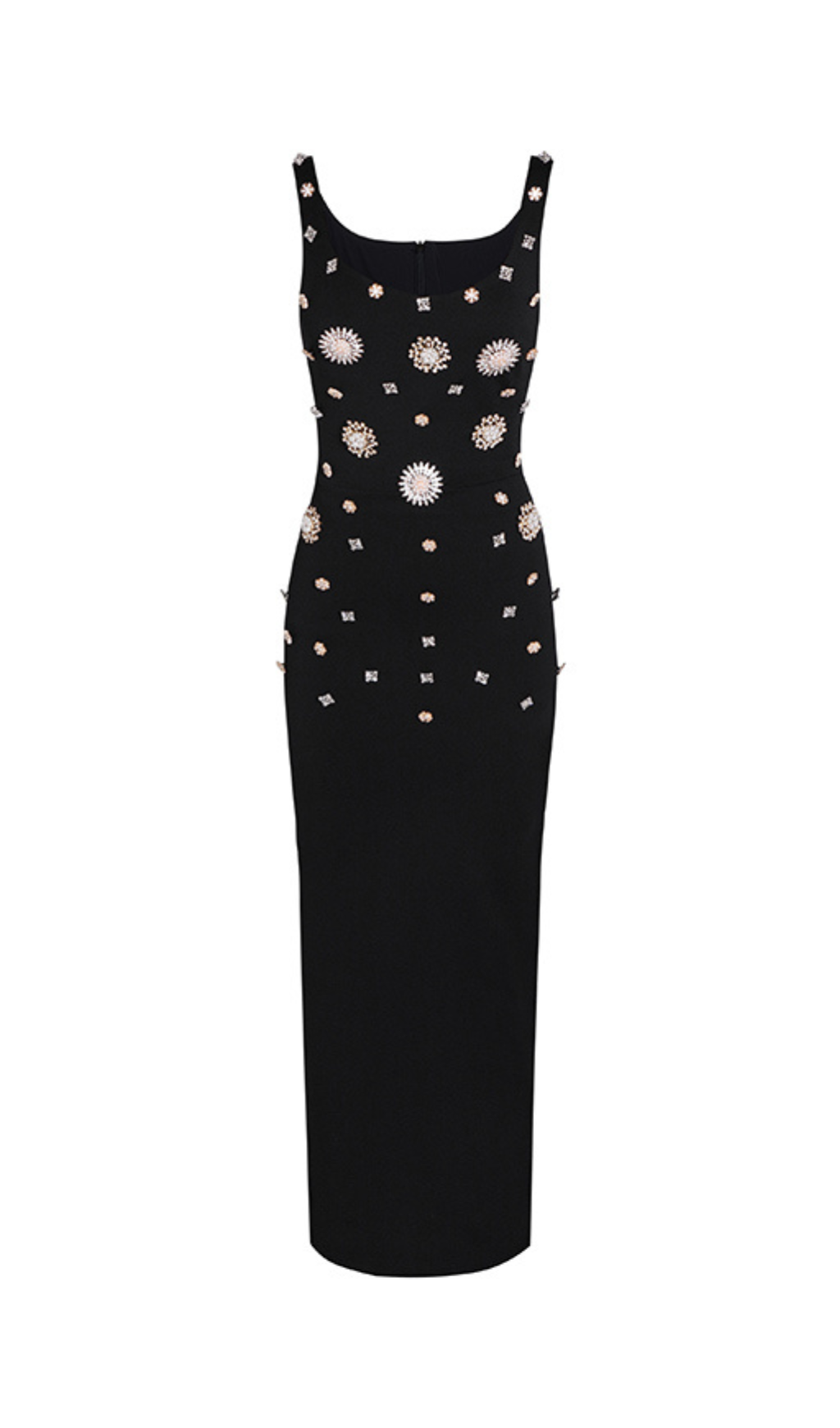 Step out and make a statement in this gown. Featuring a daring black hue, you'll be a vision of confidence and sophistication. With a daring scoopneck and intricate brooch detail, craft your own look of power and charm. Embrace the risk and make a lasting impression.