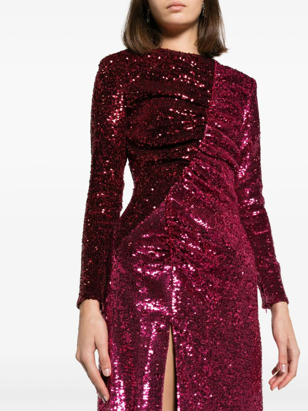 This dress will make you stand out at any event. The ruched detailing hugs your curves, while the sequins add a touch of sparkle. With its regal color and flattering design, this dress will make you feel confident and glamorous. Perfect for any special occasion.