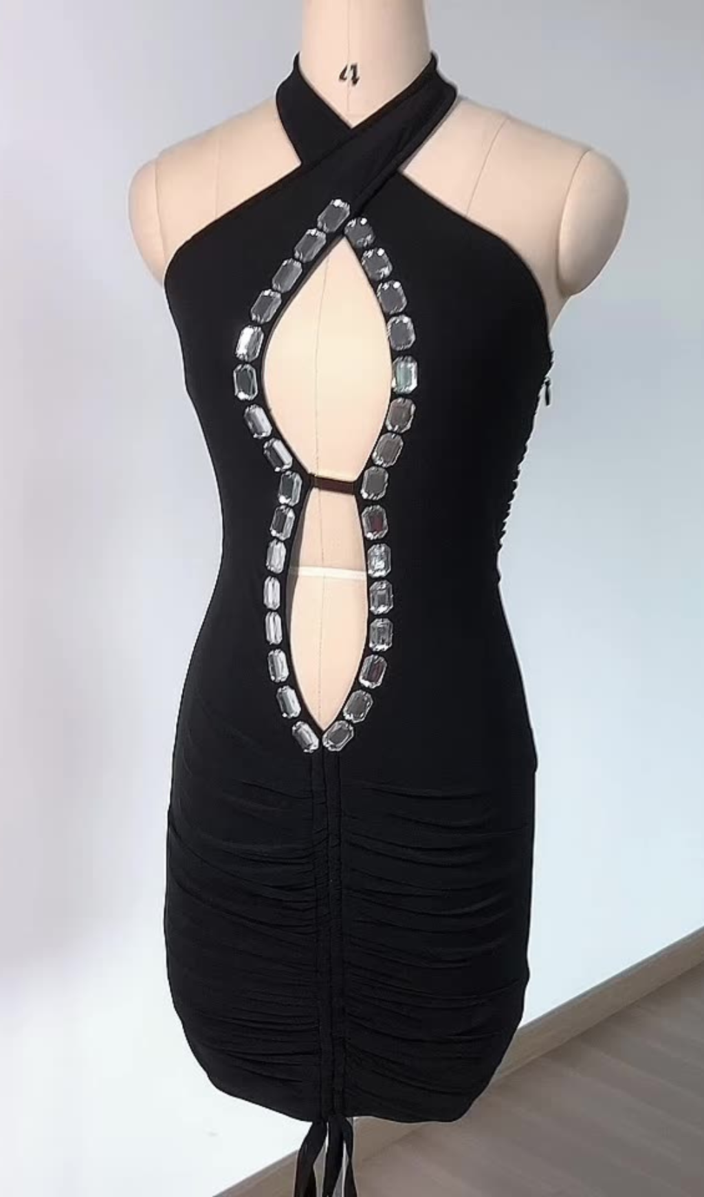 This daring and elegant dress features stunning cutouts and sparkling crystal embellishments that will surely turn heads. Perfect for a night out on the town or a special occasion, this dress will make you feel confident, bold, and ready for any adventure!