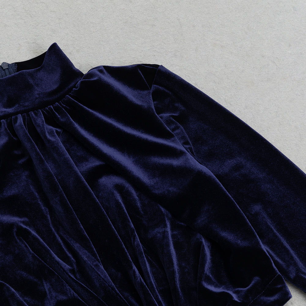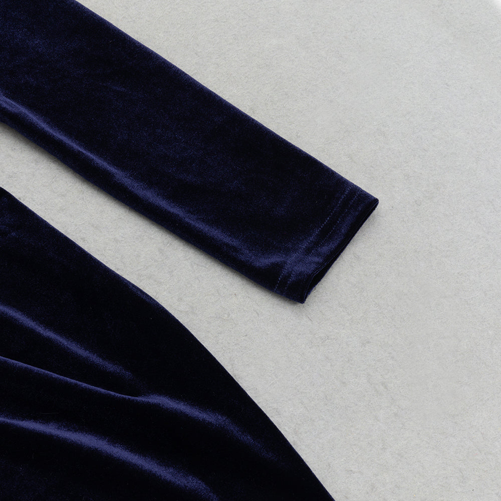 DARK BLUE HALF-HIGH COLLAR LONG-SLEEVED HOLLOW TIGHT SLIT MAXI DRESS