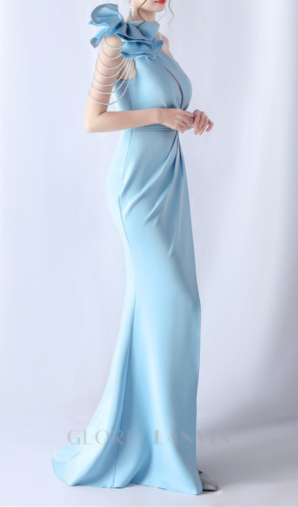 The dress features a daring cut-out and a thigh-high slit, perfect for those who love to take fashion risks. The one shoulder design and stunning floral detailing add a touch of adventure to your wardrobe. Make a statement with this must-have dress!