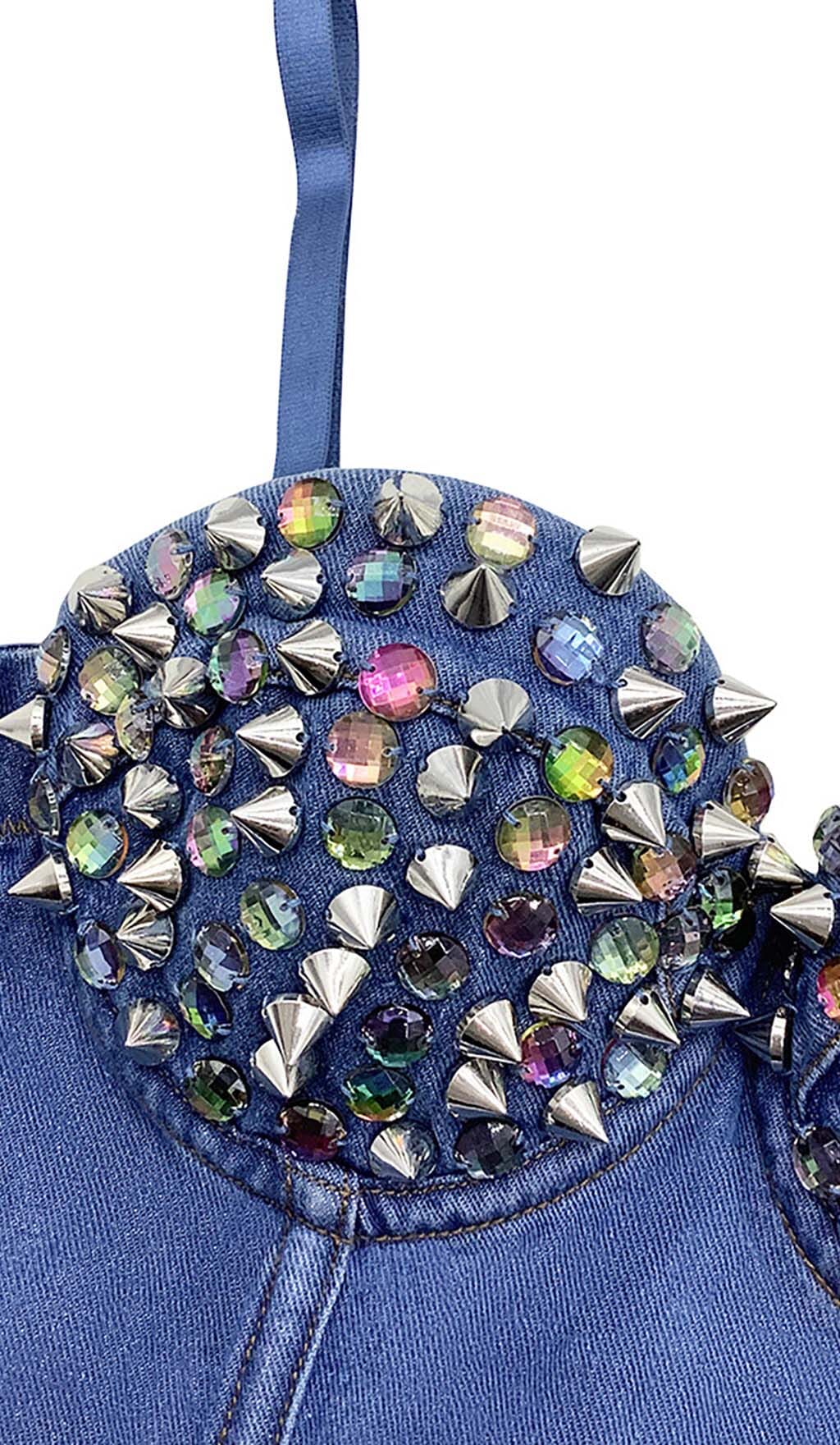 DENIM CRYSTAL CROPPED TOP IN BLUE