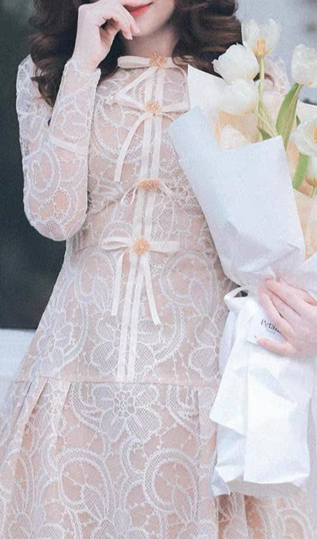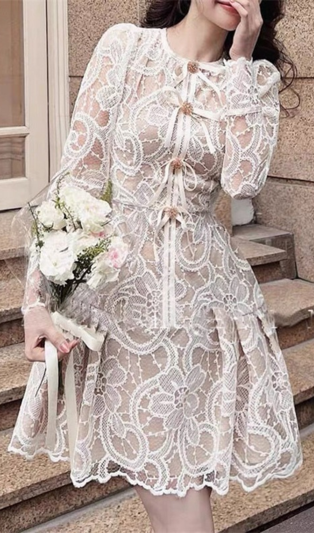 The delicate lace and bow detailing add a touch of elegance to this modern and chic dress, perfect for any special occasion. The diamond buttons add a subtle yet eye-catching detail, making this dress a must-have in your wardrobe.