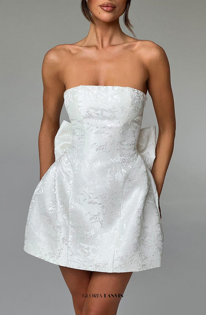 THE dress of the season has landed and you're going to be obsessed. Meet Elenora, our dreamy mini with a pretty structured skirt and waist cinching bodice. This strapless style is complete with lace up and an oversized bow to the back for perfect feminine drama.