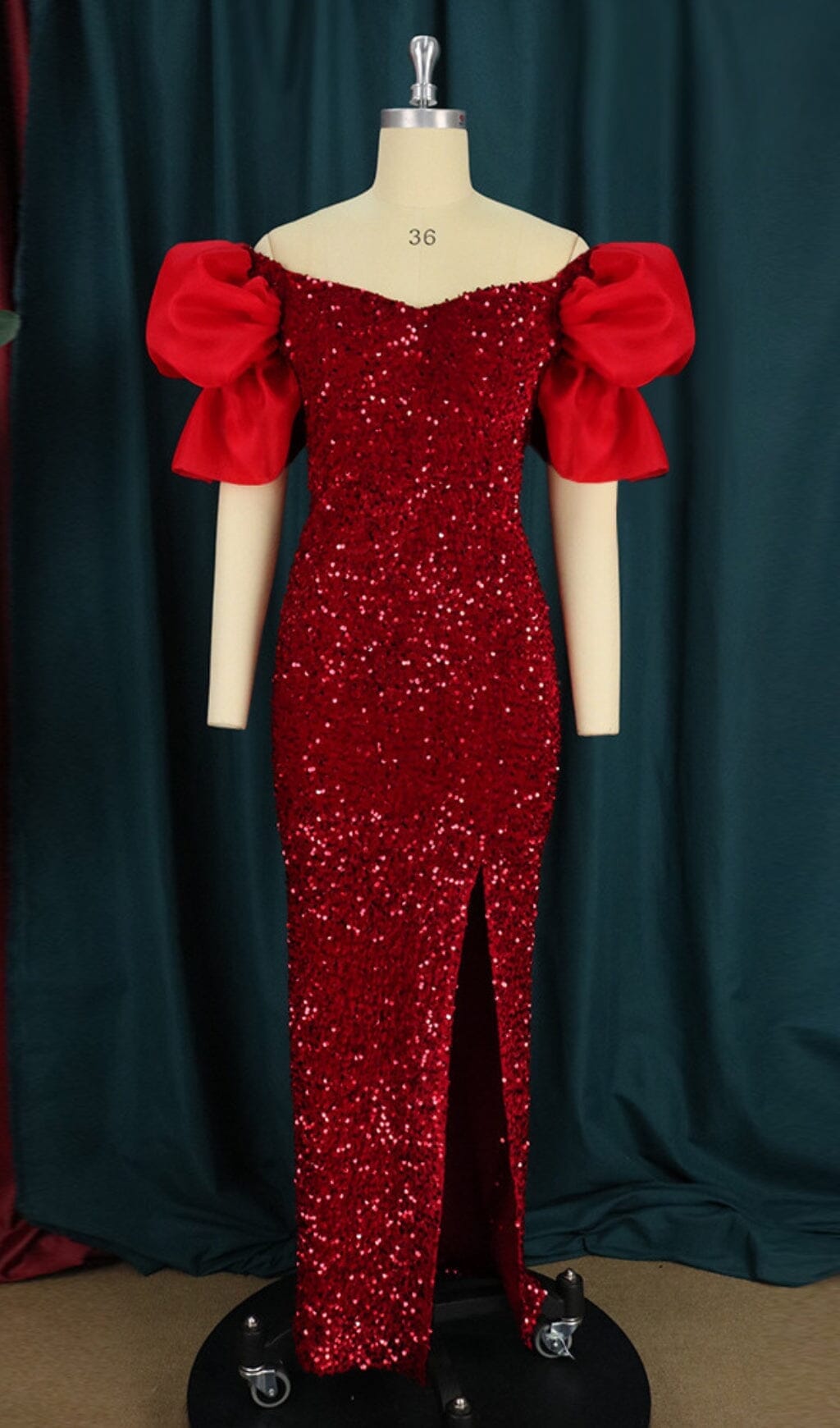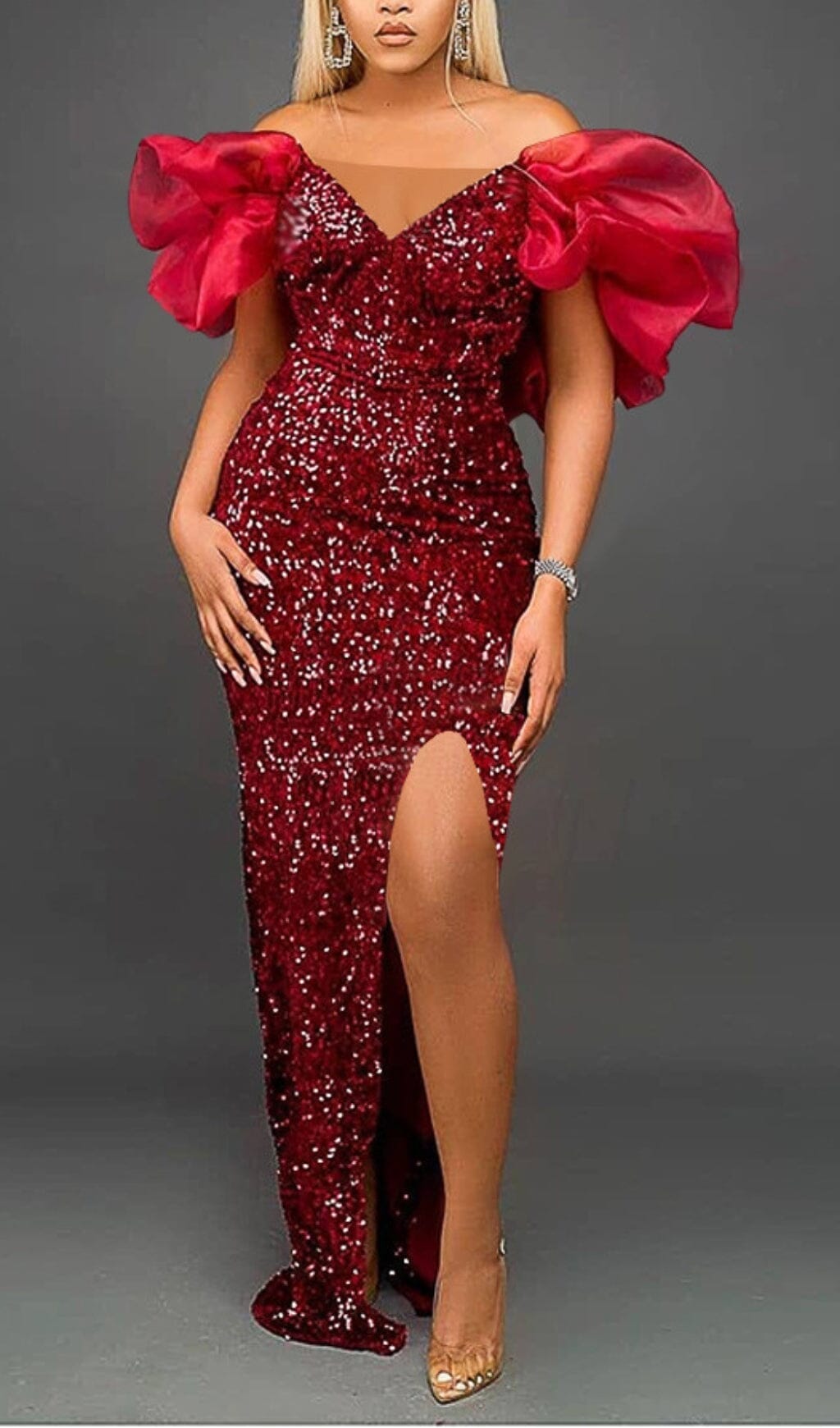 This puff-sleeved red sequin dress is very suitable for the holiday robe. Red can highlight the complexion well, and it is also full of a strong festive atmosphere. It looks particularly exquisite and age-reducing with sequins. The irregular stacking of cuffs can well coordinate the head-to-shoulder ratio, which is very French romantic, lazy and fashionable, and is very suitable for parties on various festivals.