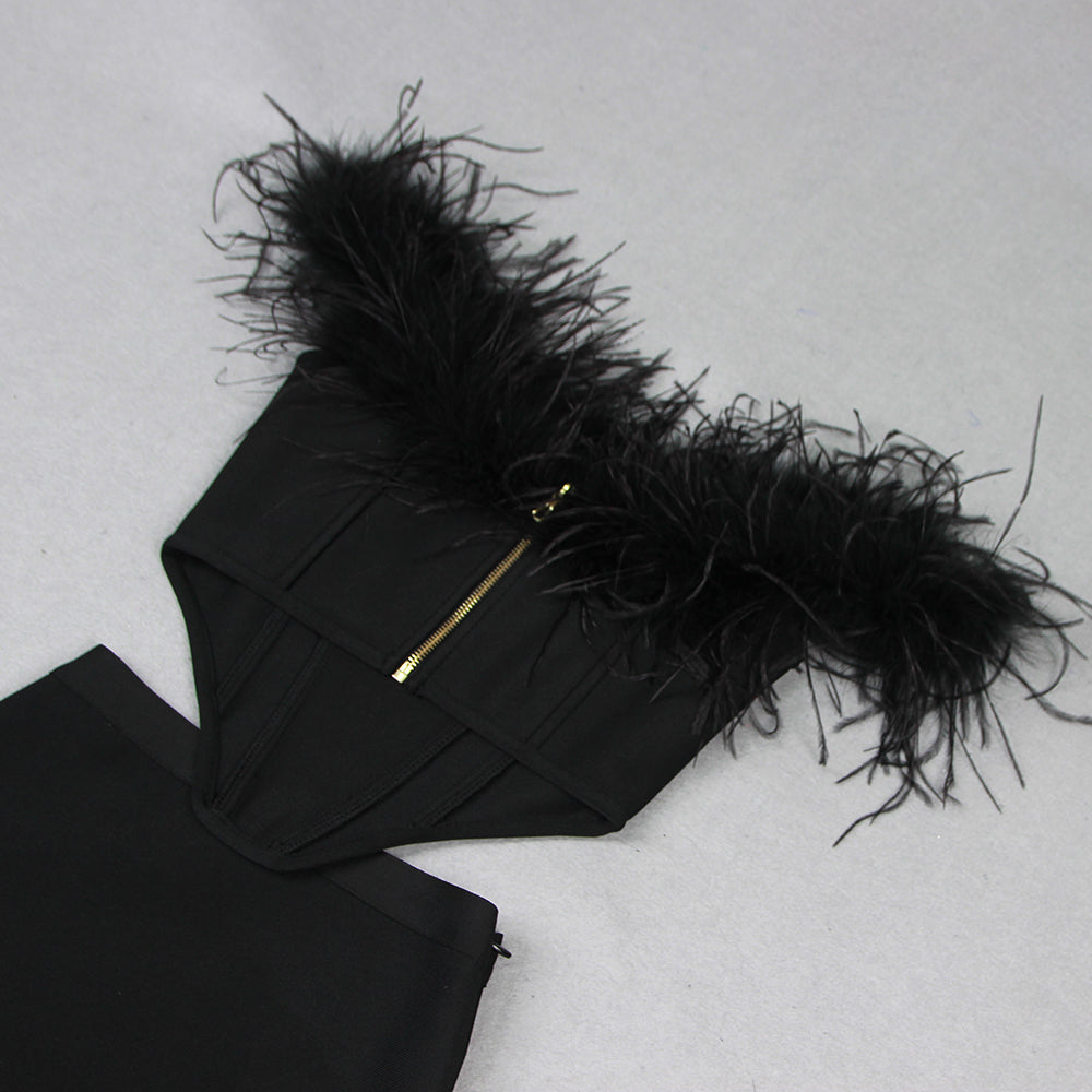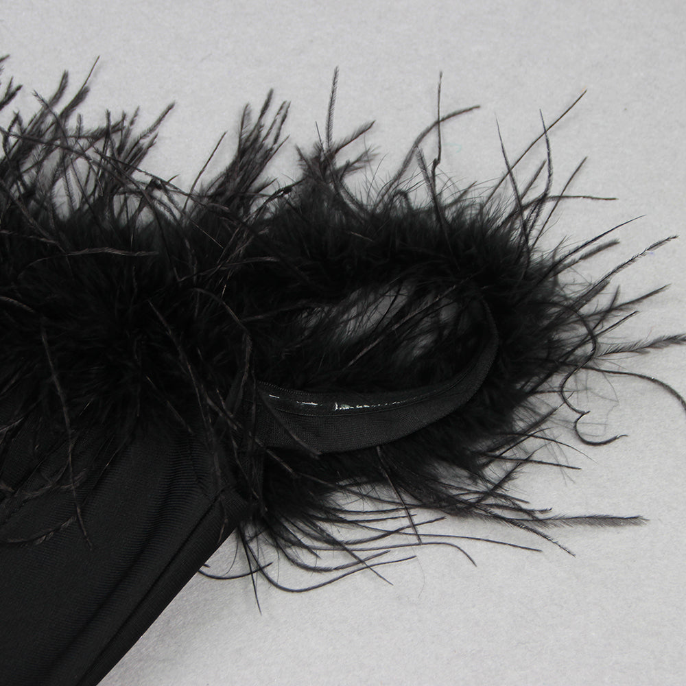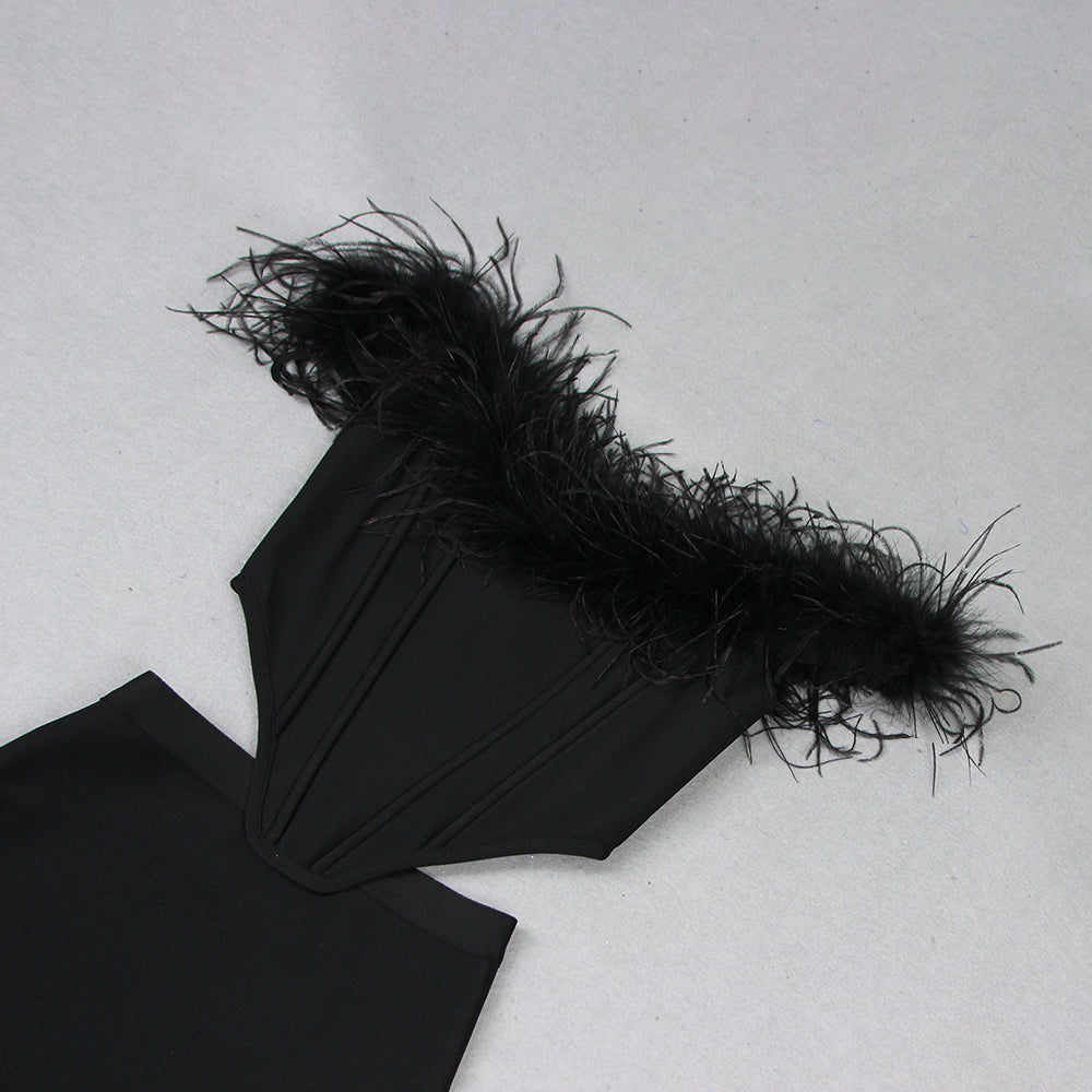 FEATHER OFF SHOULDER MERMAID MAXI DRESS BLACK