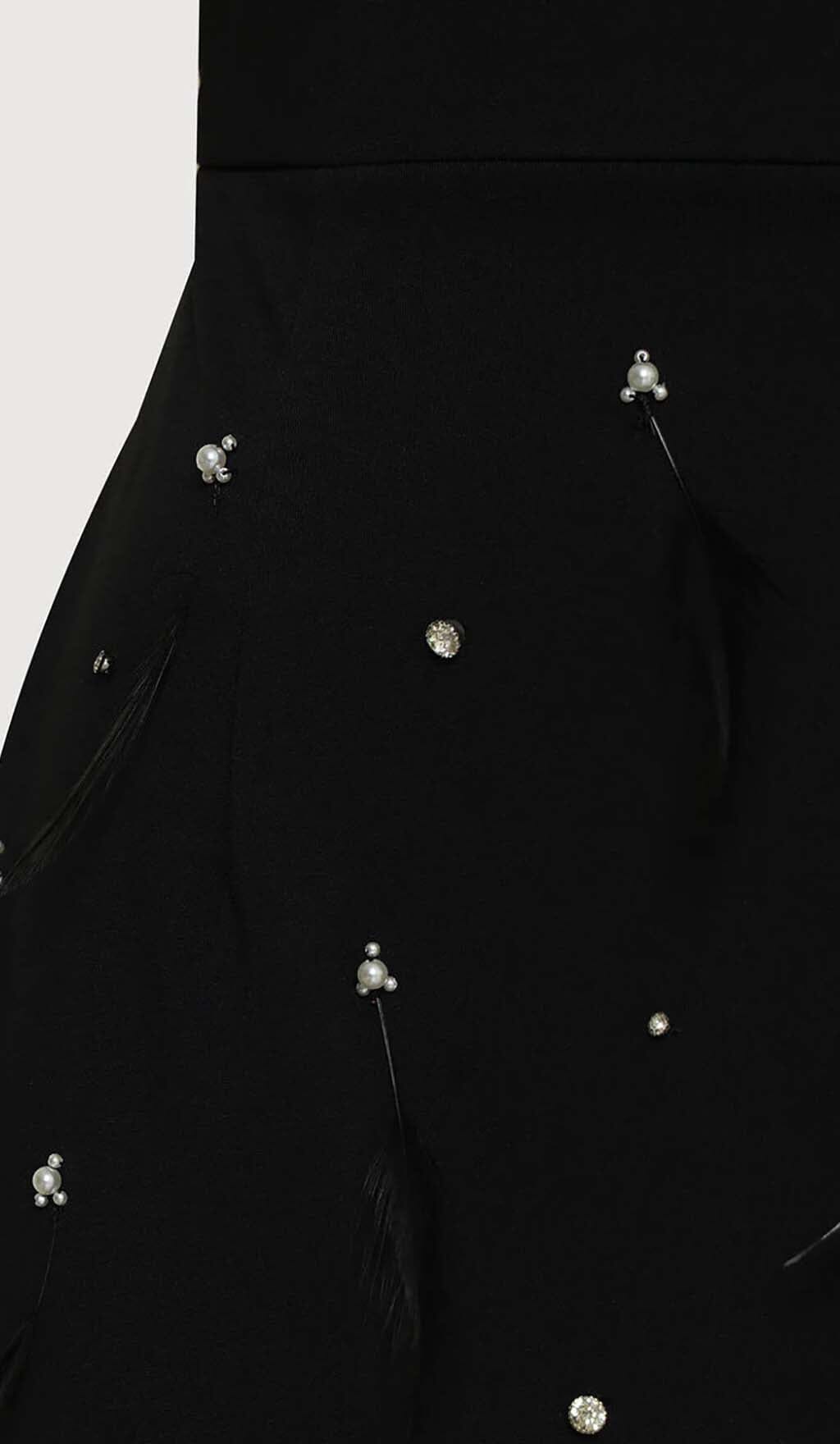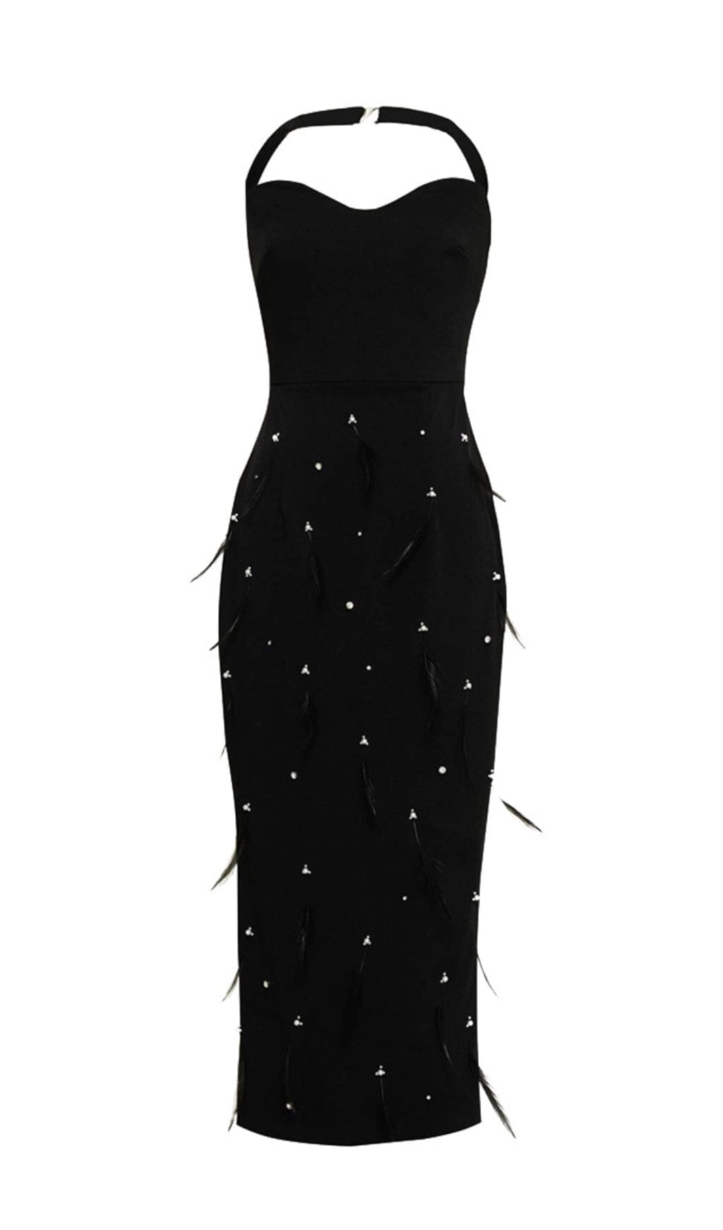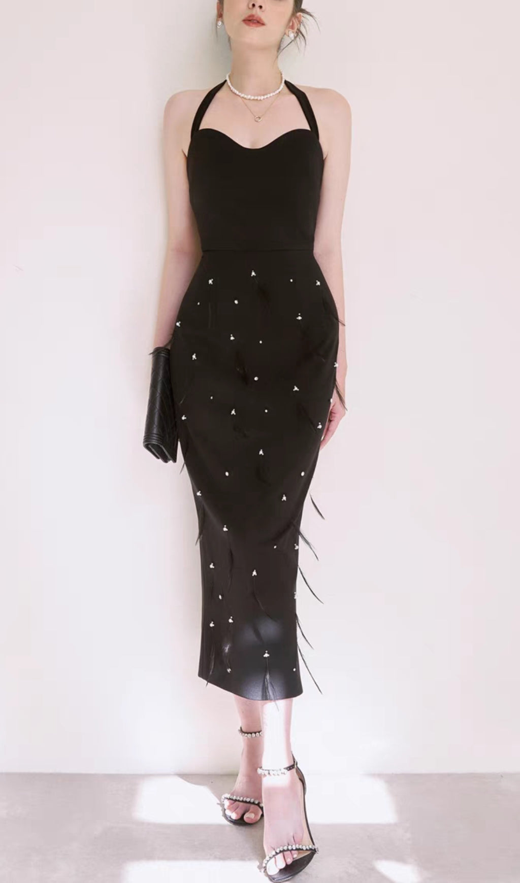 FEATHER RHINESTONES BODYCON MIDI DRESS IN BLACK
