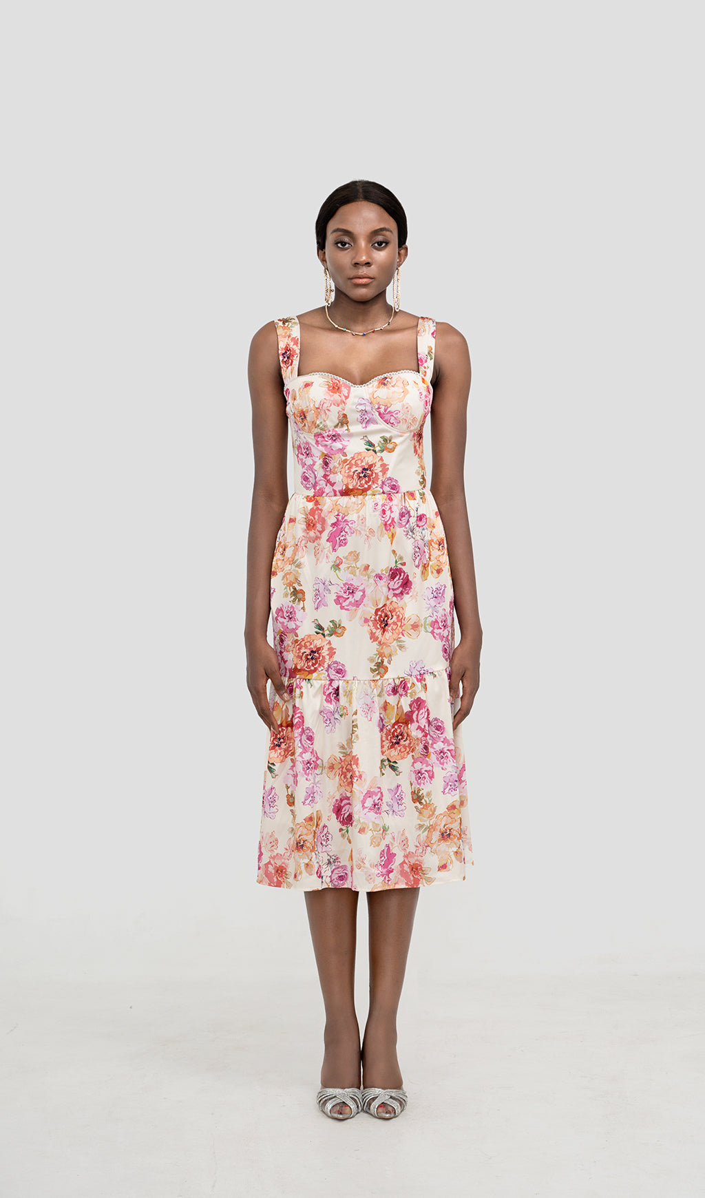 This midi-length dress is crafted from ivory cotton and adorned with subtle floral embroidery. Its flowy silhouette and charming details make it the perfect choice for any special occasion.