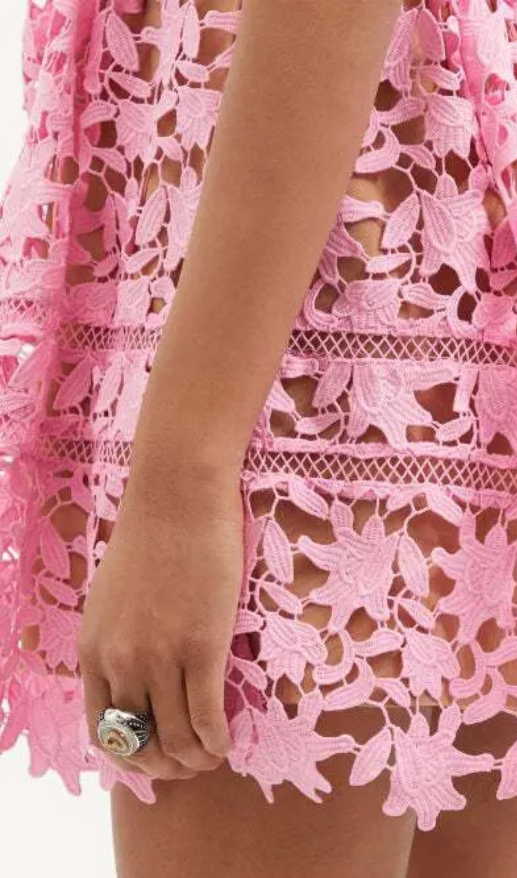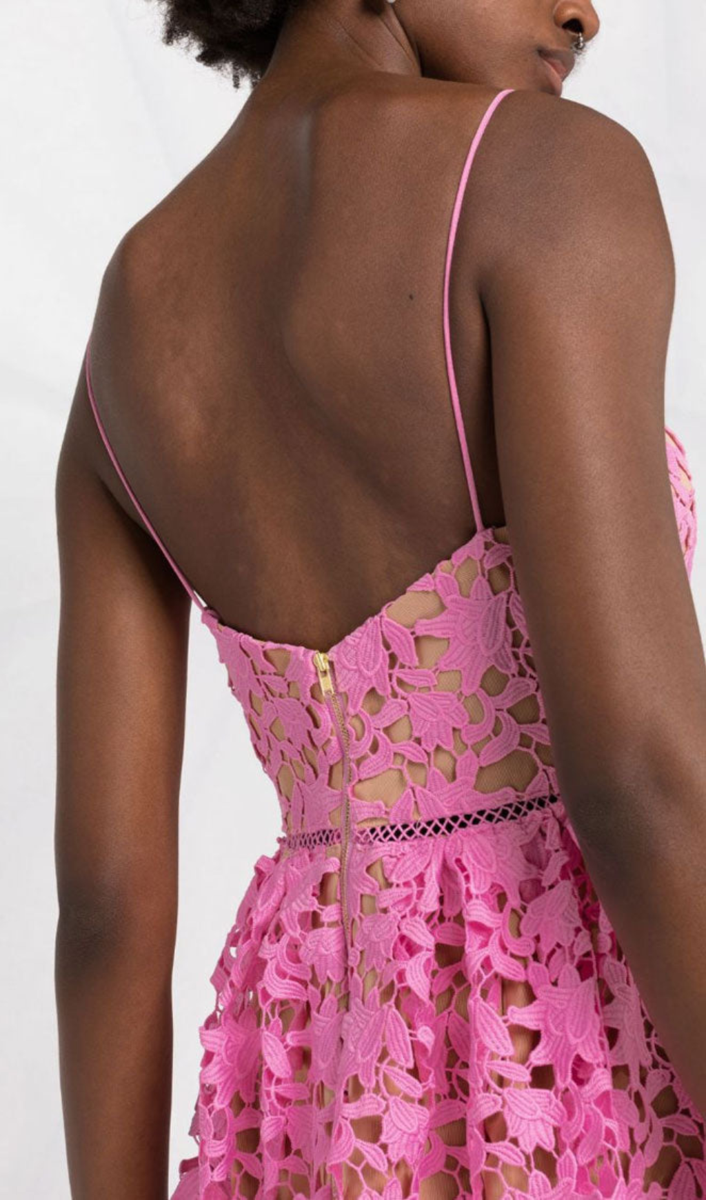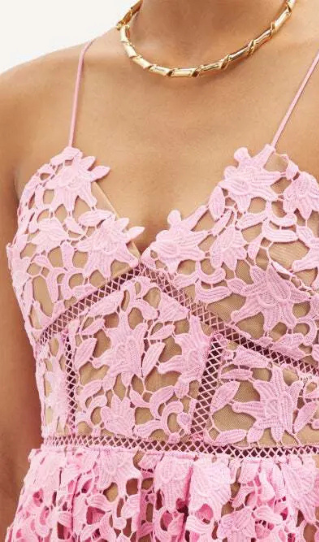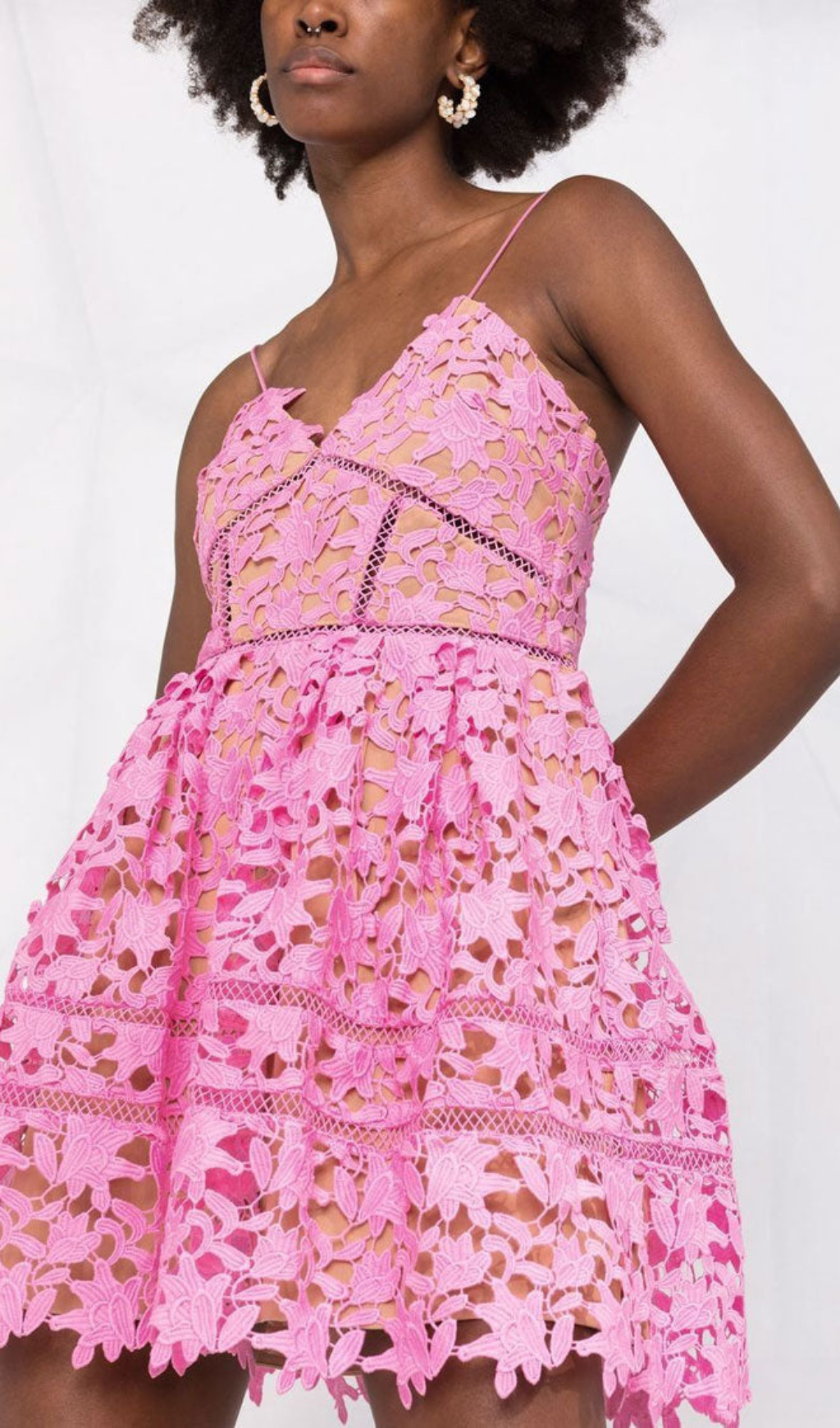 Look beautiful in this pink floral mini dress, made of delicate guipure lace with spaghetti straps. Perfect for a romantic dinner date or a night out with the girls! (Now that's something to party about!)