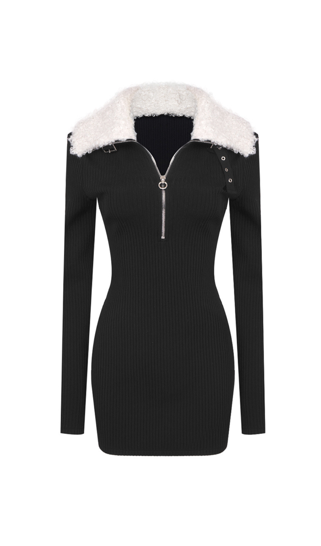 You won’t forego style for warmth in this mini dress. The bodycon design is crafted from a stretchy wool blend and is finished with a faux shearling collar.