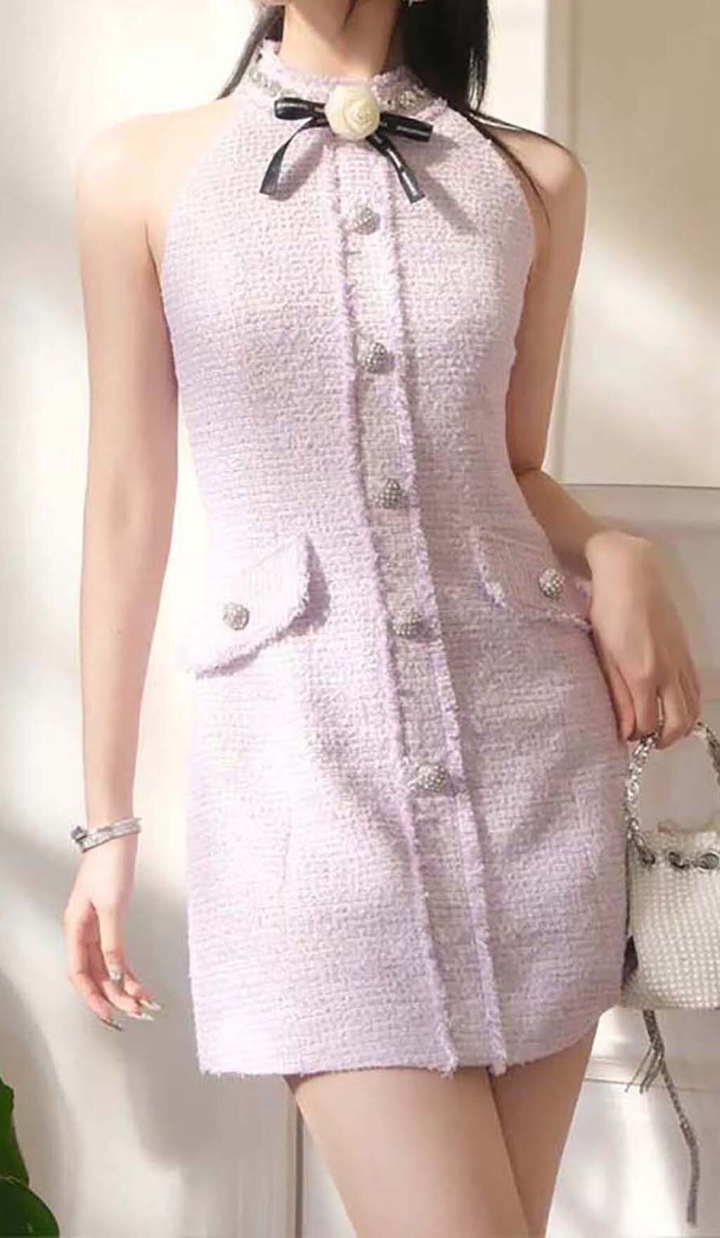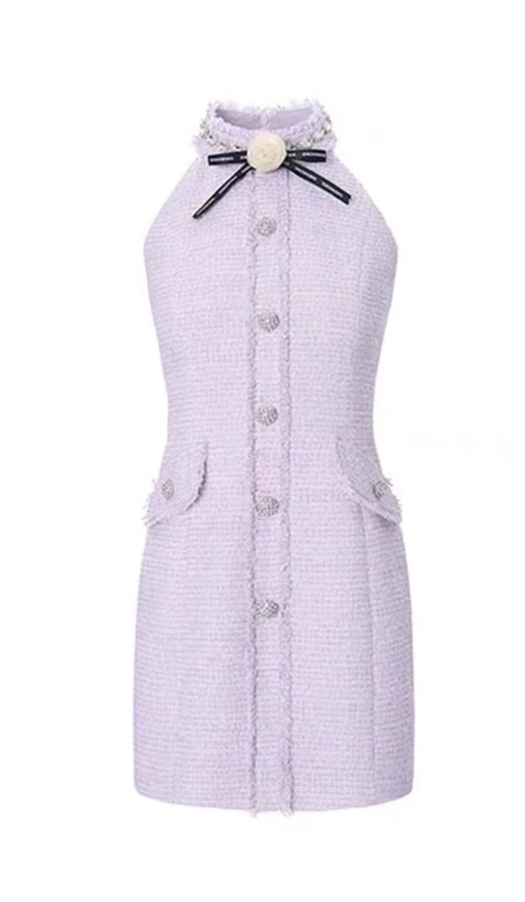HALTER BOW NECK TWEED MINI DRESS IN LILAC