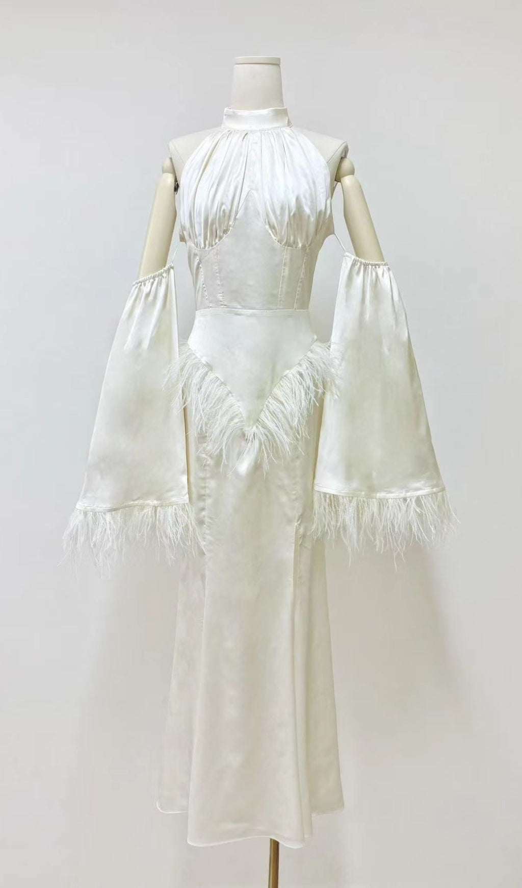 Step into the spotlight in our Halterneck Feather Satin Dress! The gentle white color and feather detailing will make you stand out. The halterneck design adds a touch of elegance, while the satin fabric gives off a luxurious feel. Perfect for a special occasion, this dress will make you feel confident and stylish.