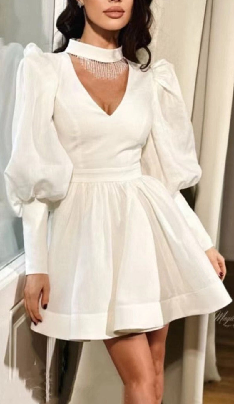 Discover an eye-catching look with this Halterneck V-neck Mini Dress. Puff sleeves and sparkling rhinestone fringe add drama to any occasion. Feel confident and glamorous in this stunning mini dress.