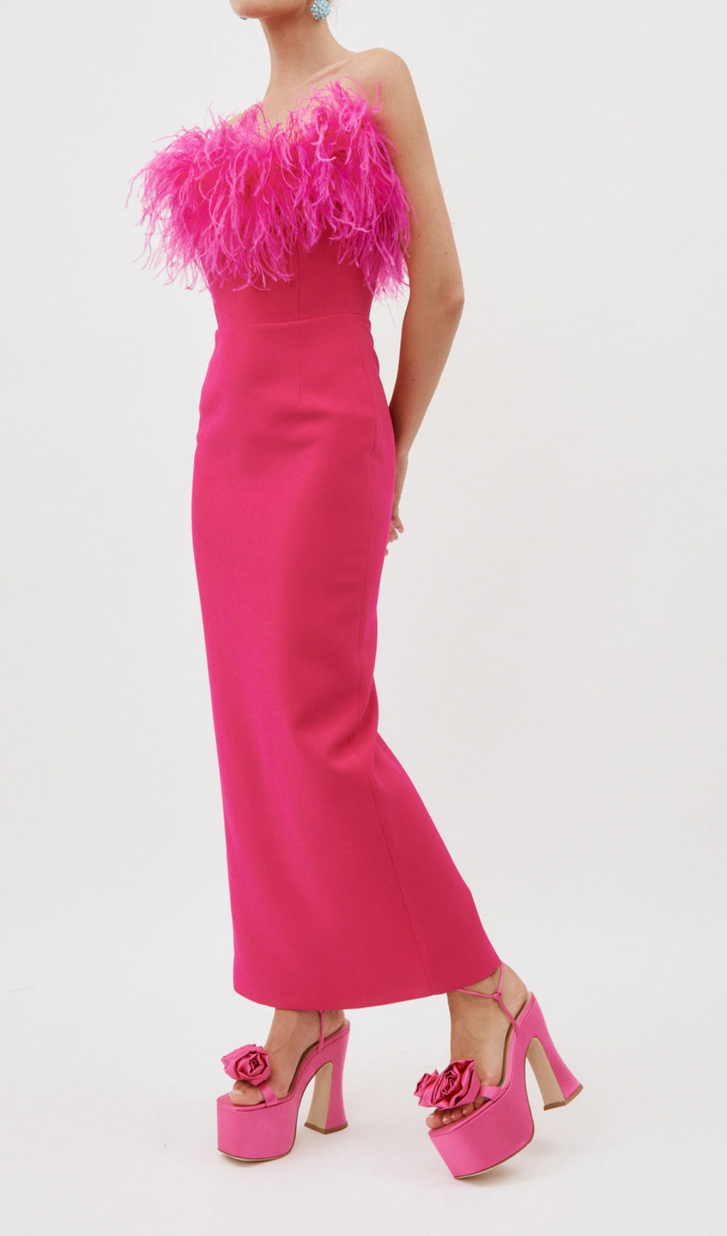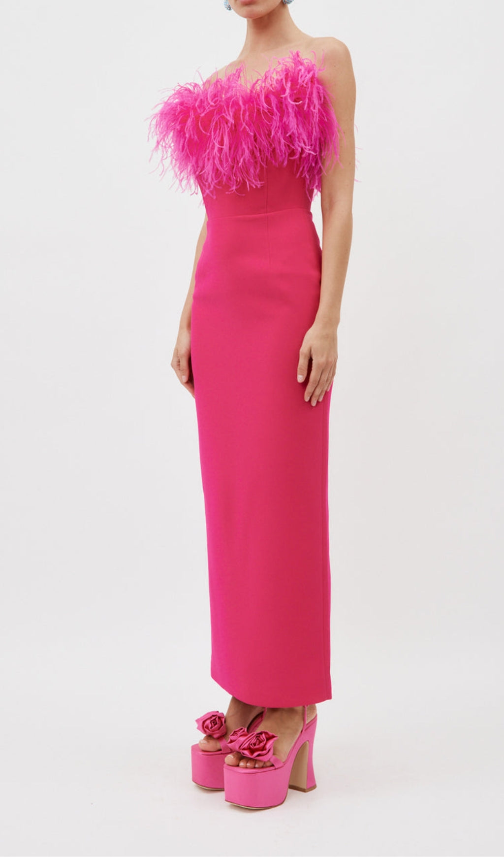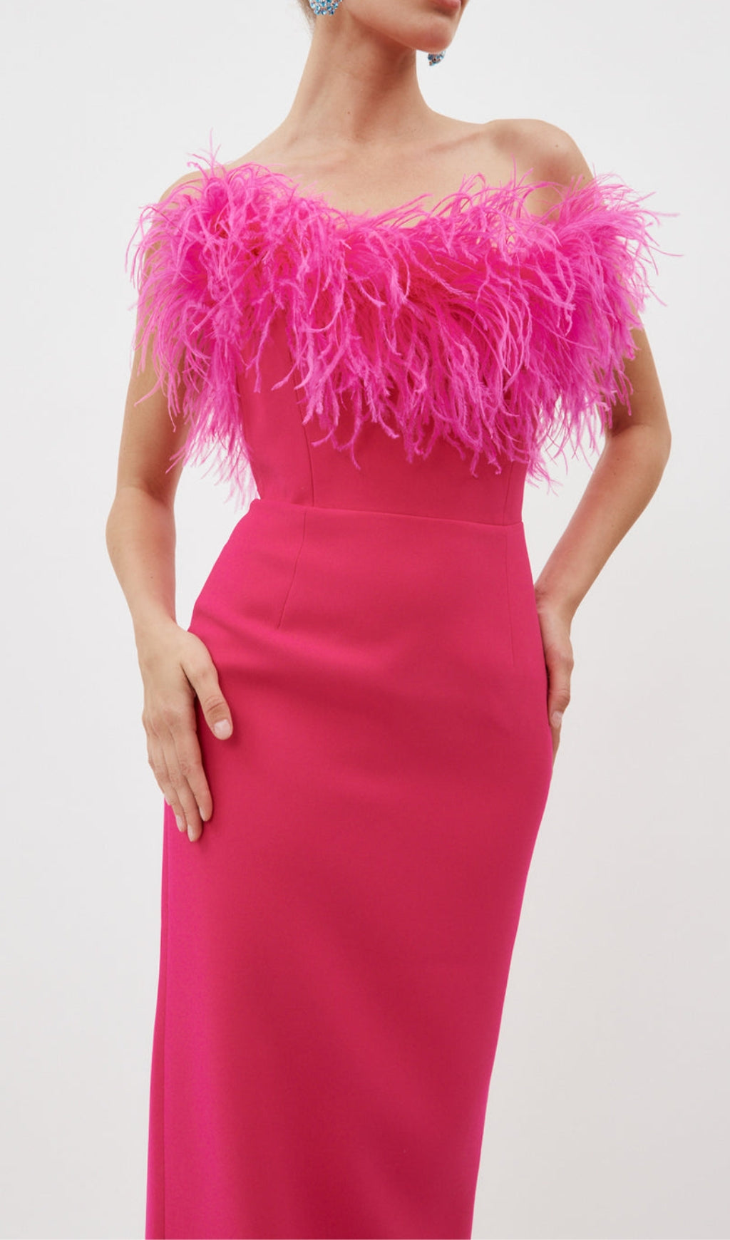 Fuchsia crepe strapless dress with ostrich trim 100% Polyester Gentle Dry Clean OnlyBust 31.5”/ 80cm ,Waist 24.5”/ 62cm,Hips 34.5”/ 88cm,Height 5’7