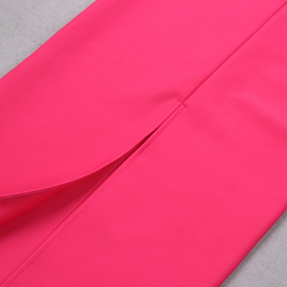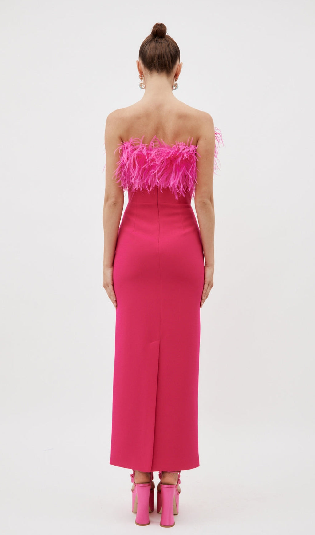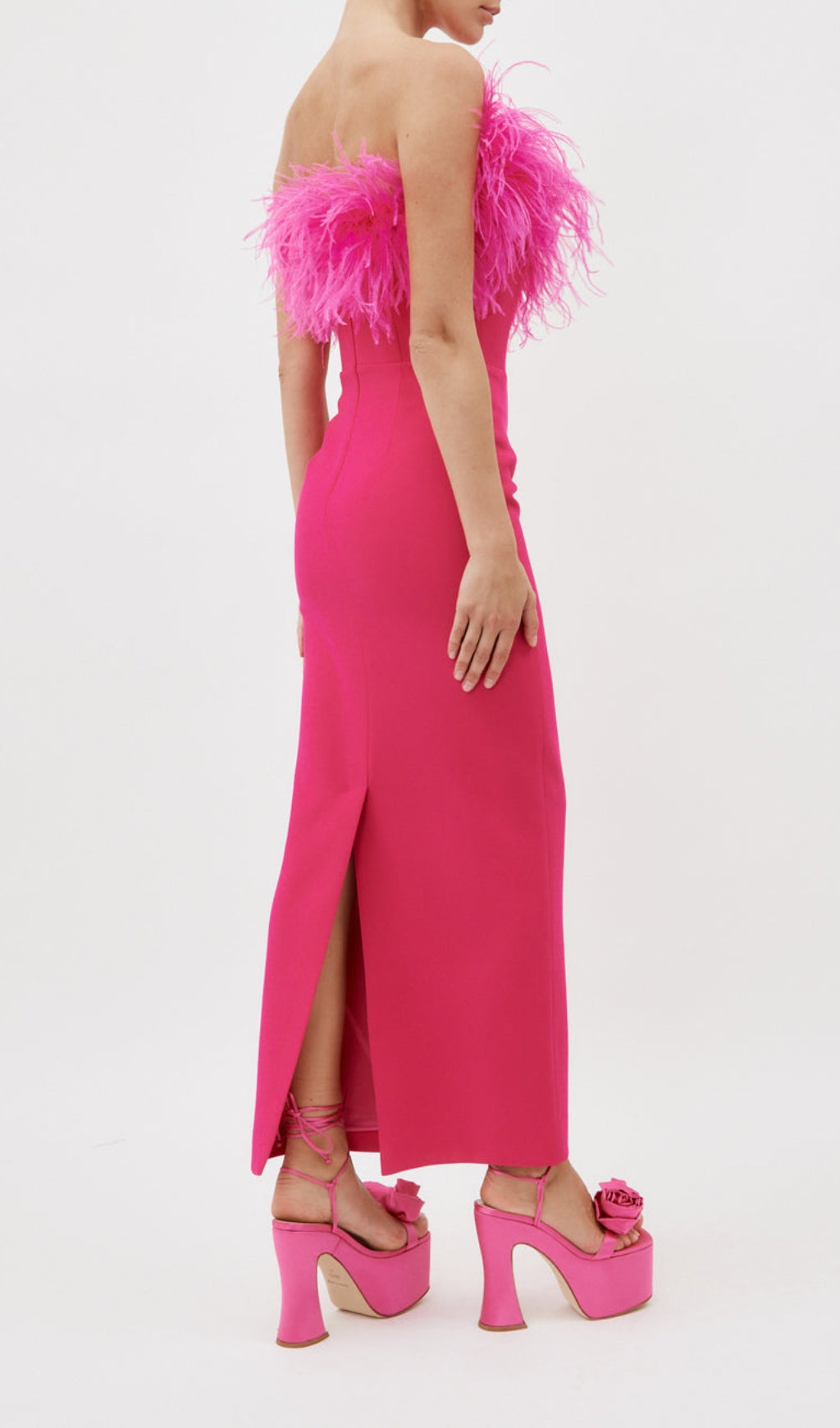 Fuchsia crepe strapless dress with ostrich trim 100% Polyester Gentle Dry Clean OnlyBust 31.5”/ 80cm ,Waist 24.5”/ 62cm,Hips 34.5”/ 88cm,Height 5’7