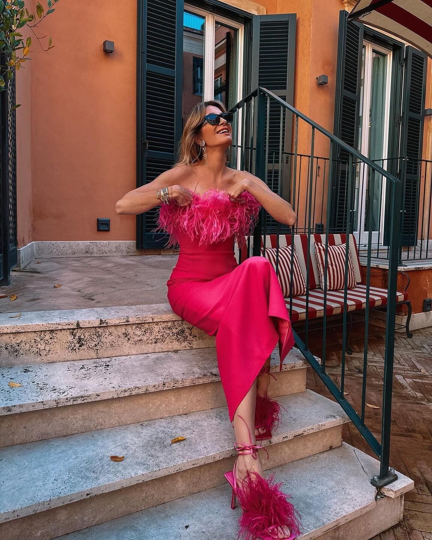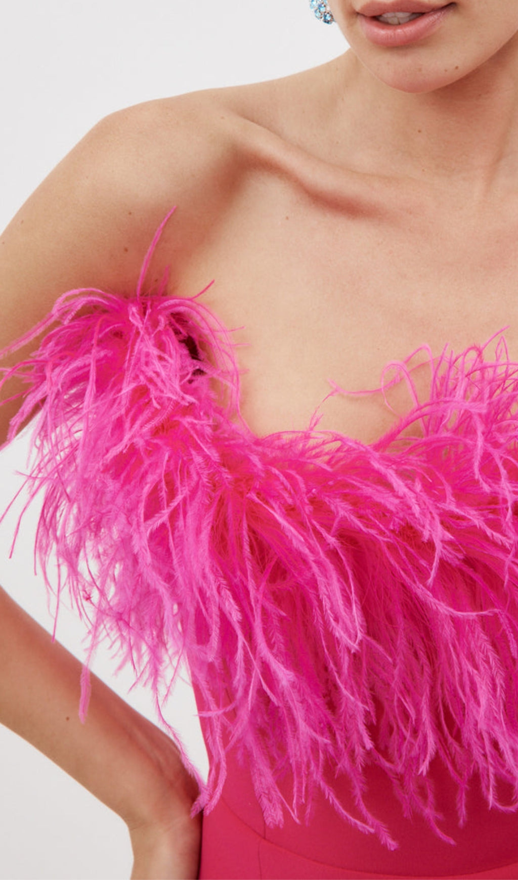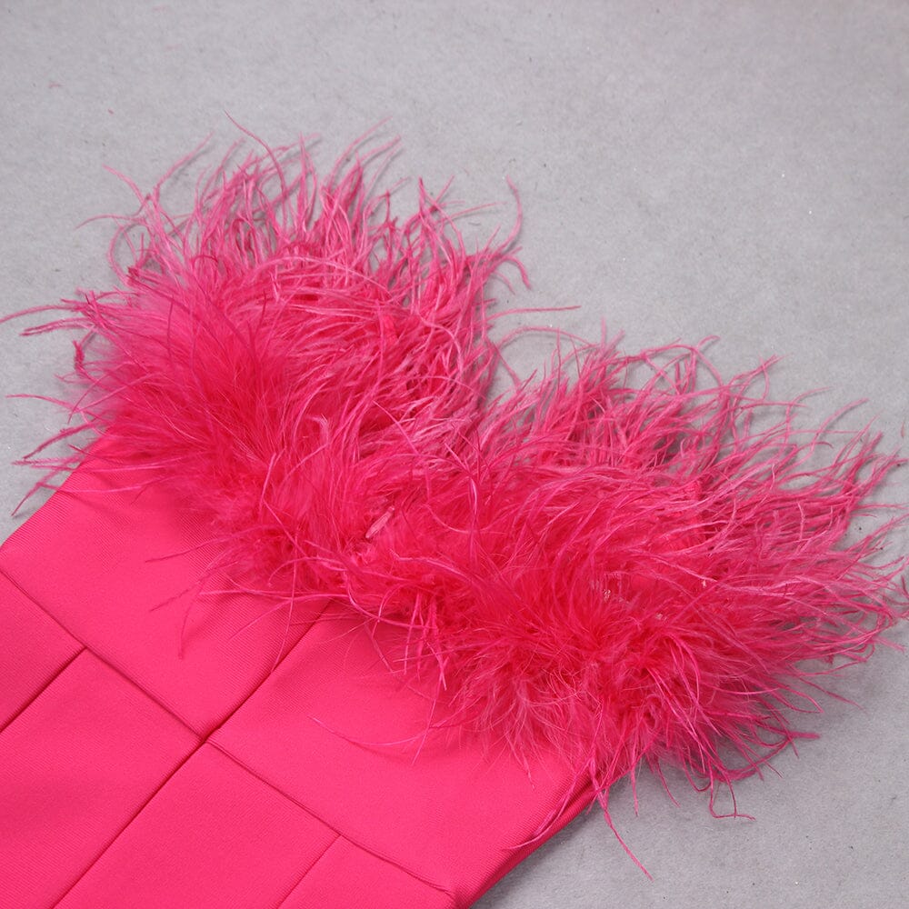 Our dress was so elegant that it was a must for the party. The pink feathers on the chest are so flattering, tightening the waist and wrapping the hips. Fully lined and comfortable to wear.