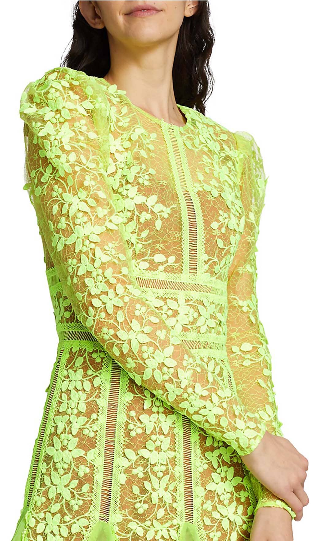 Elegant Green Lace Overlays This Ethereally Romantic Plated Midi Dress. Look Darkly Dreamy in This Midi Dress Featuring Decadent Embroidered Lace Layered Over Light-Catching Plated Fabric.