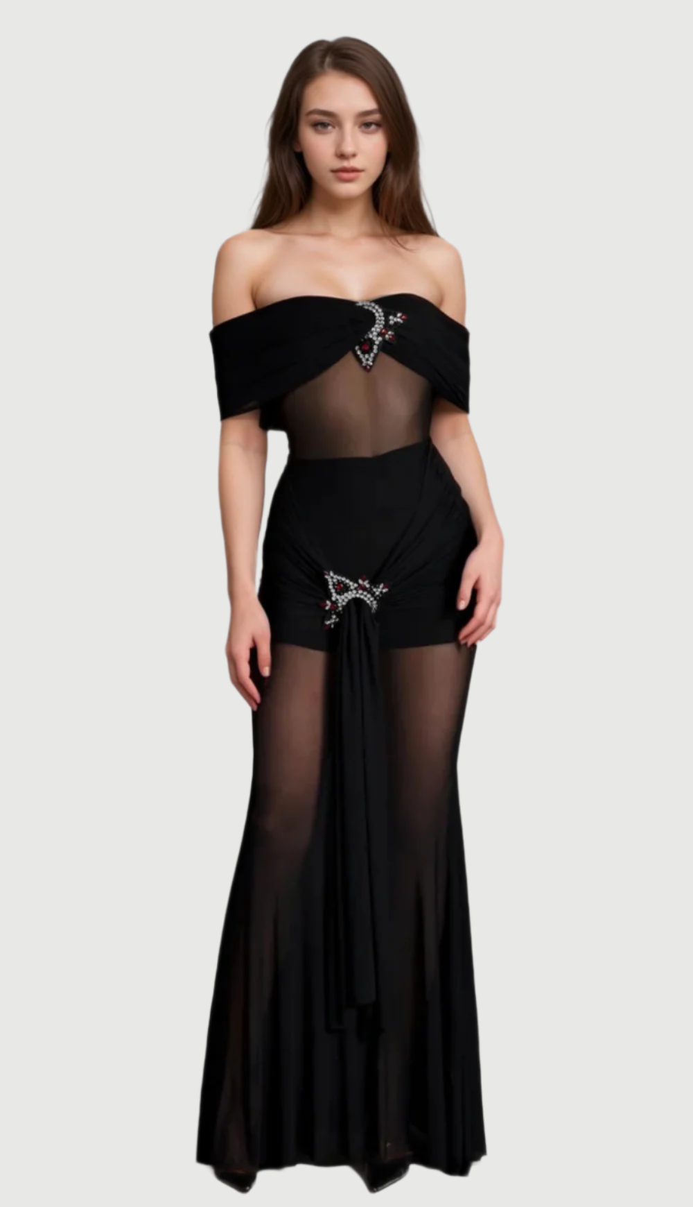 Embrace transparency with our crystal sheer mesh dress. This dress features an off-shoulder design that highlights your neckline and shoulders, adding a touch of sophistication. The sheer mesh fabric creates a flattering silhouette that drapes gracefully over your curves. Adorned with crystal embellishments, this dress sparkles with every movement, ensuring you stand out in any crowd. Perfect for glamorous evenings, and cocktail parties.