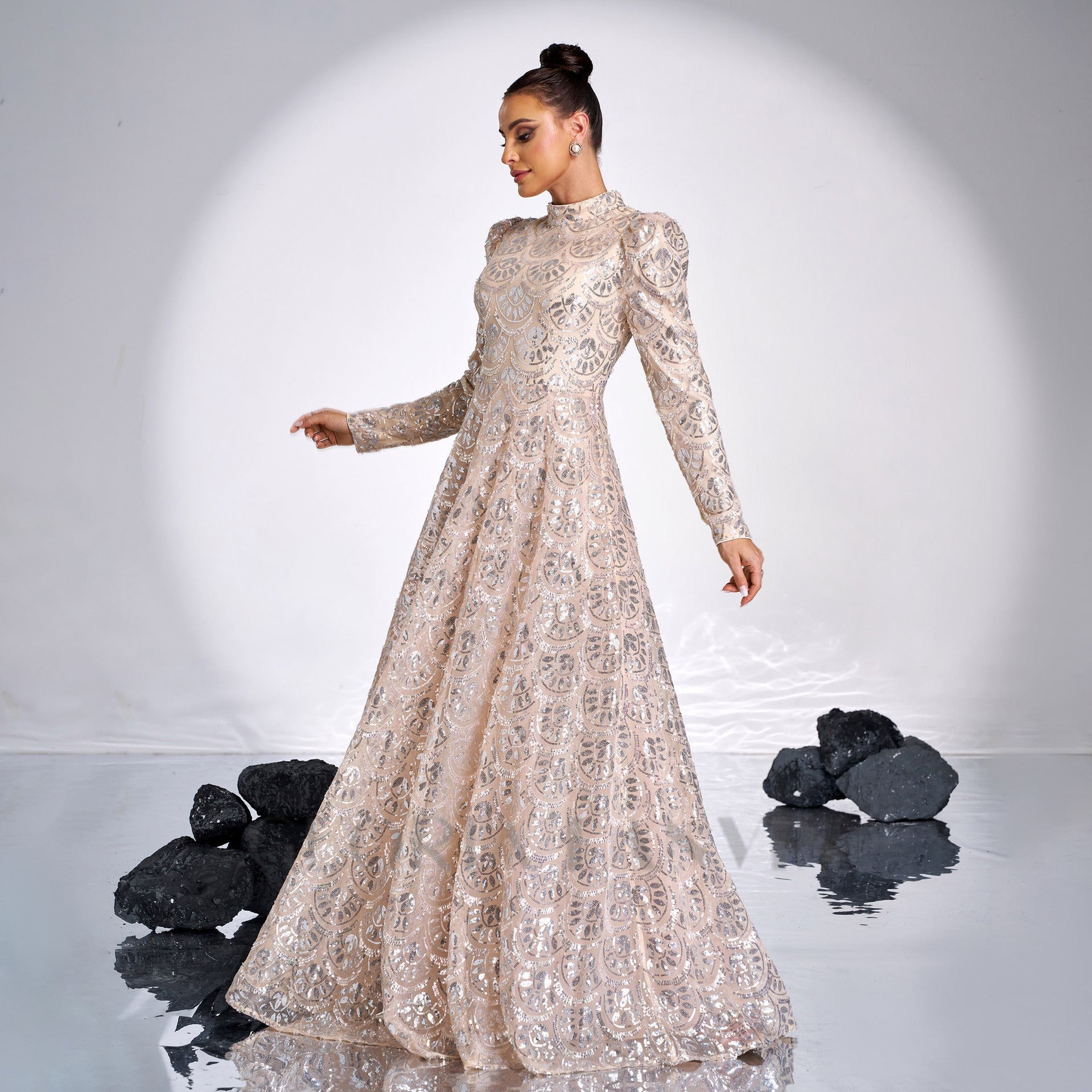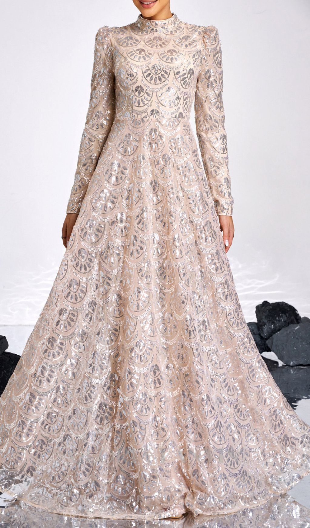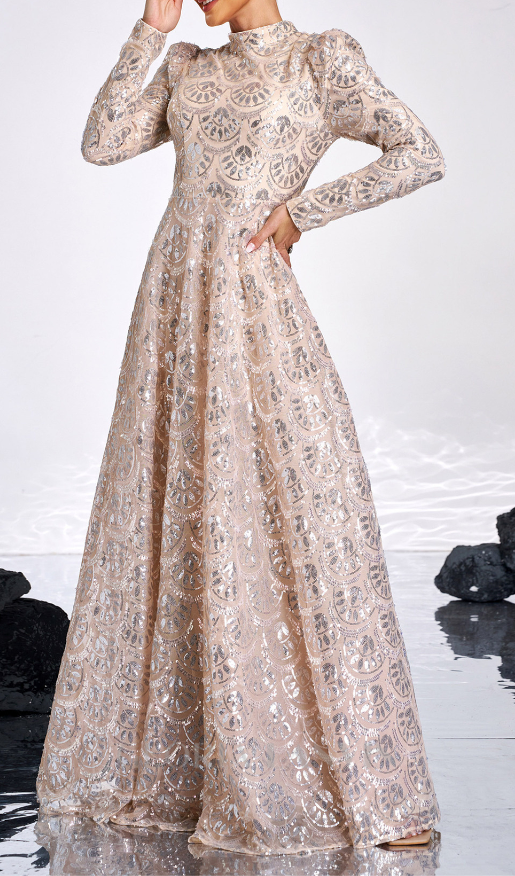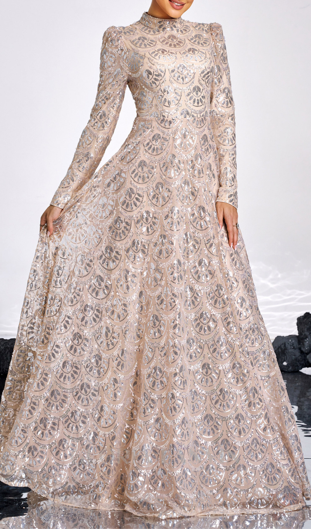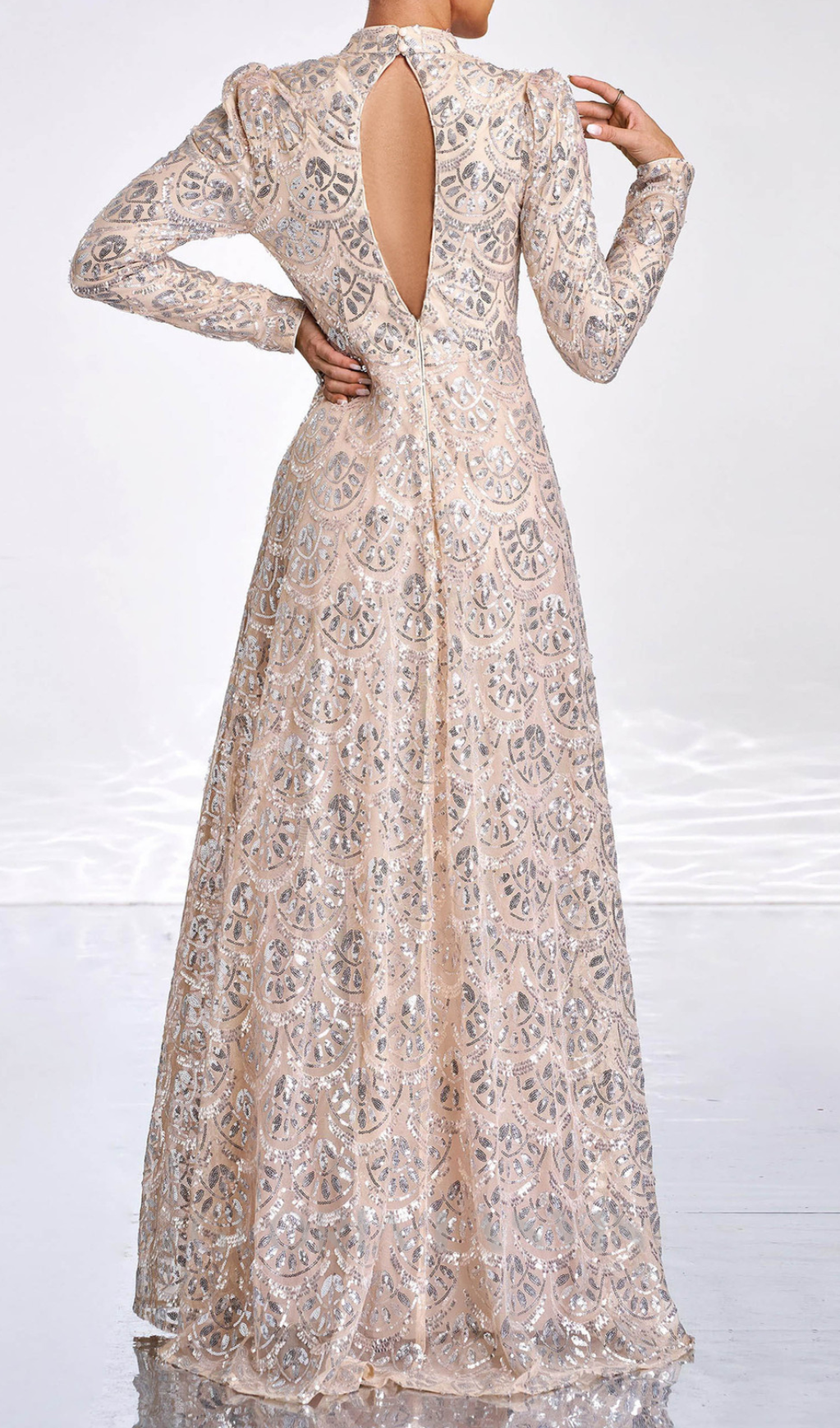 Glitter and shine all night in our Long Sleeve Lace Back Sequin maxi Dress! The perfect mix of elegance and playfulness, this golden beauty features stunning lace detailing and a flowing silhouette. Get ready to turn heads and steal the spotlight at any event.