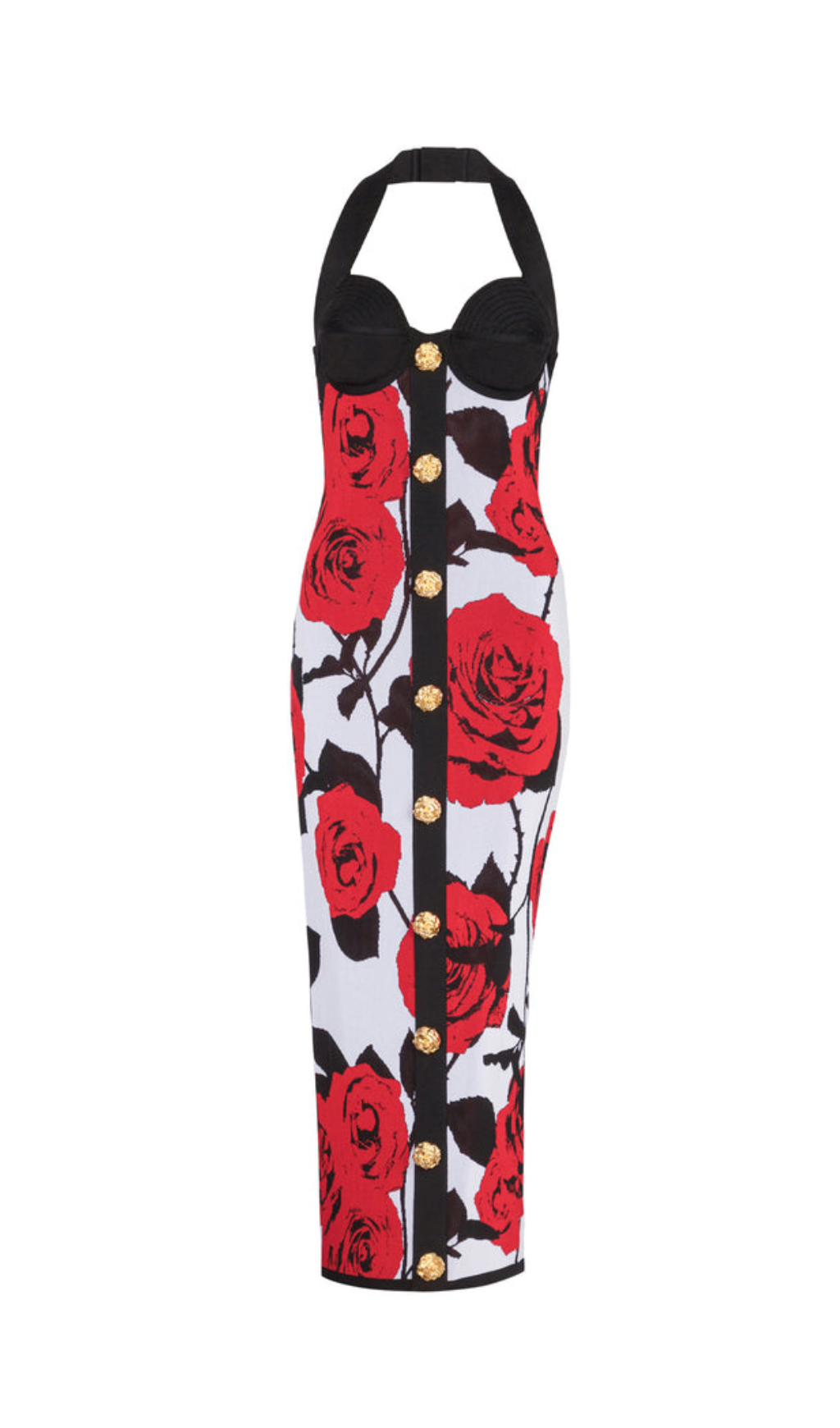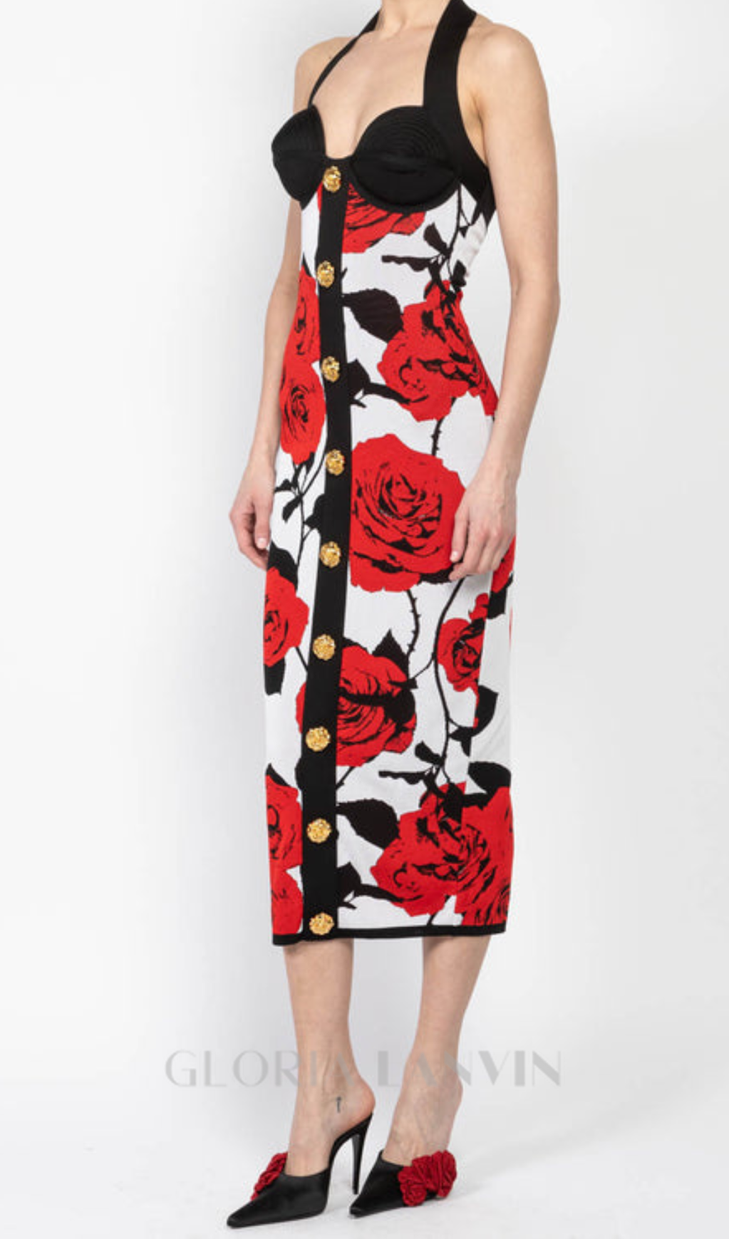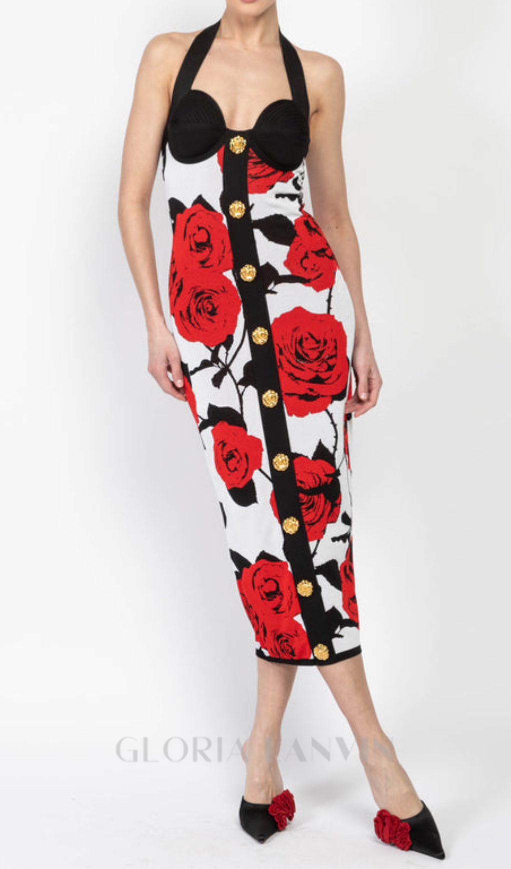 MULTICOLOR HALTERNECK ROSE PRINT MIDI DRESS