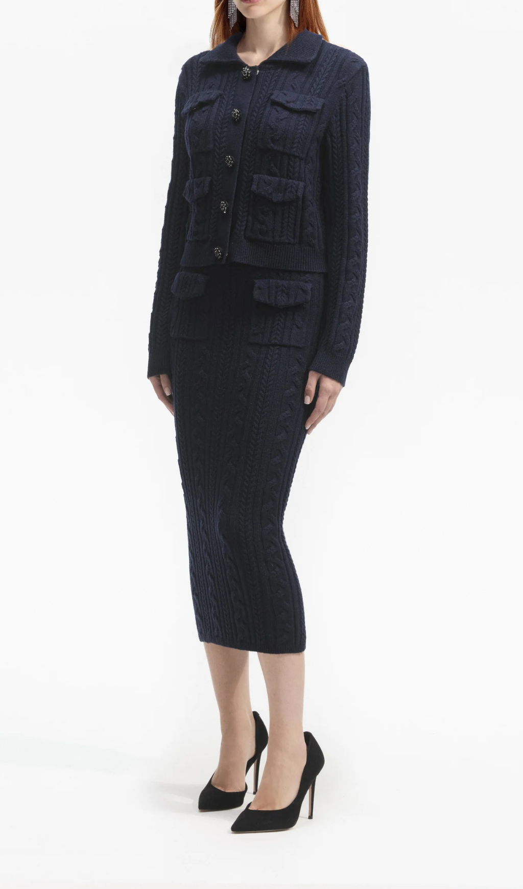 This playful skirt is knit to perfection in a classic navy color that will easily match with any top. Show off your quirky side and add some humor to your wardrobe with this unique midi skirt. Perfect for any casual outing.