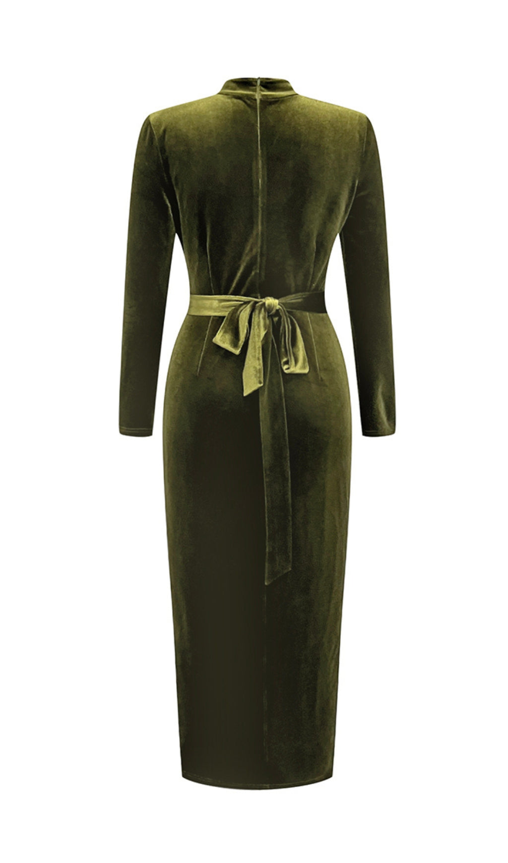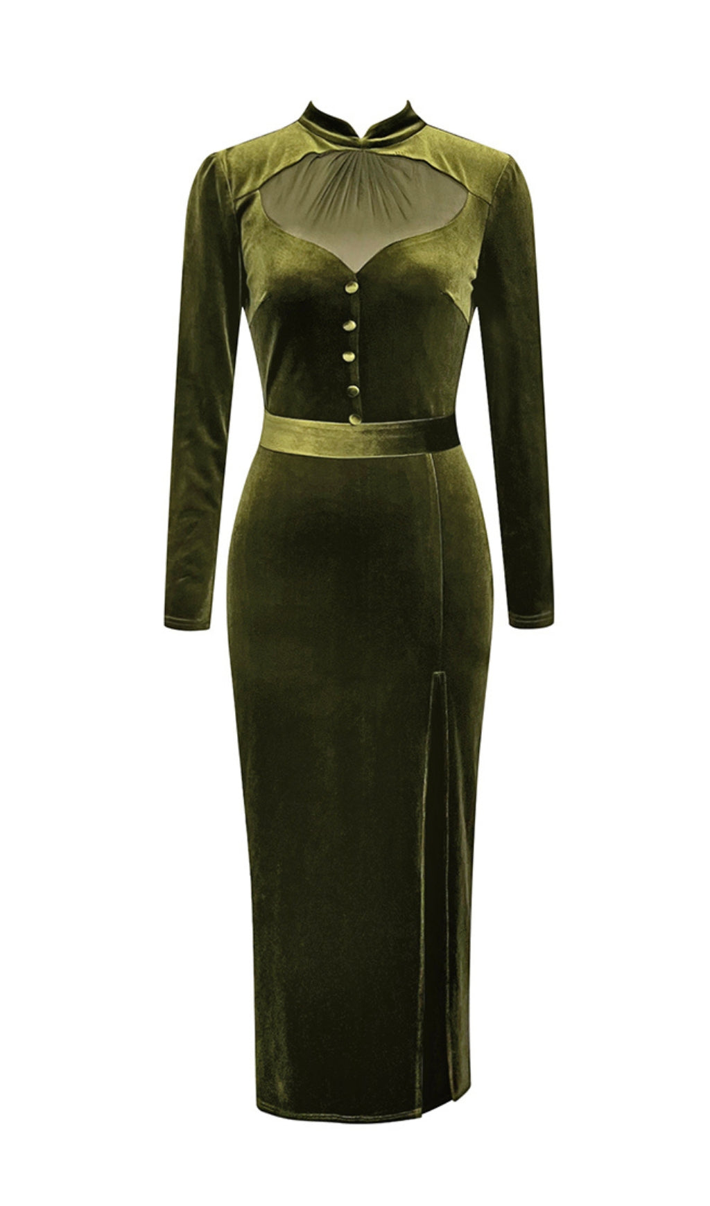 OLIVE GREEN MESH VELVET SLIT HIP-HUGGING DRESS – Gloria Lanvin