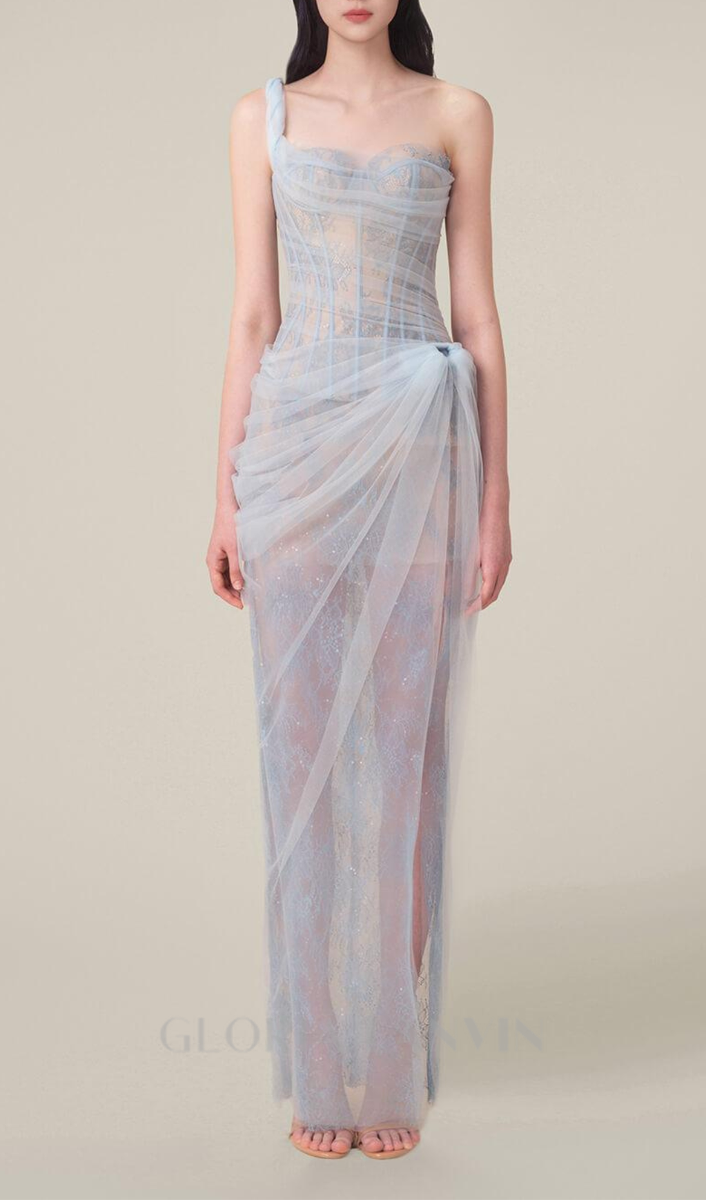 -Special Features: Corset design, Sarong on one side with ring, Two--layer skirt, Twisted one shoulder strap