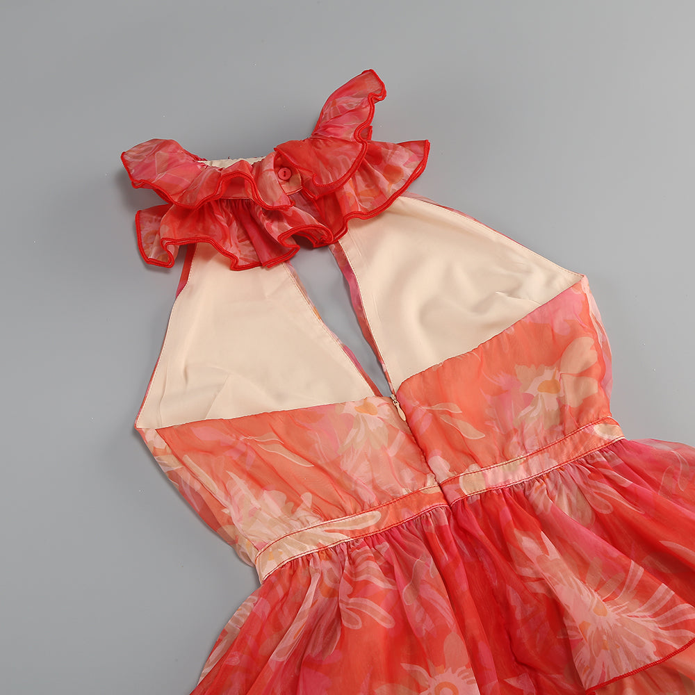 ORANGE FLORAL PRINTED SHEEVELESS HALTER MAXI DRESS