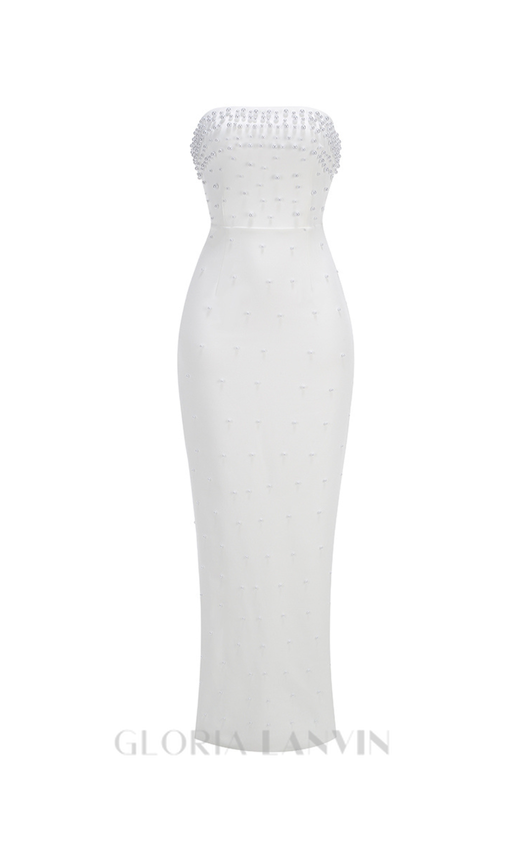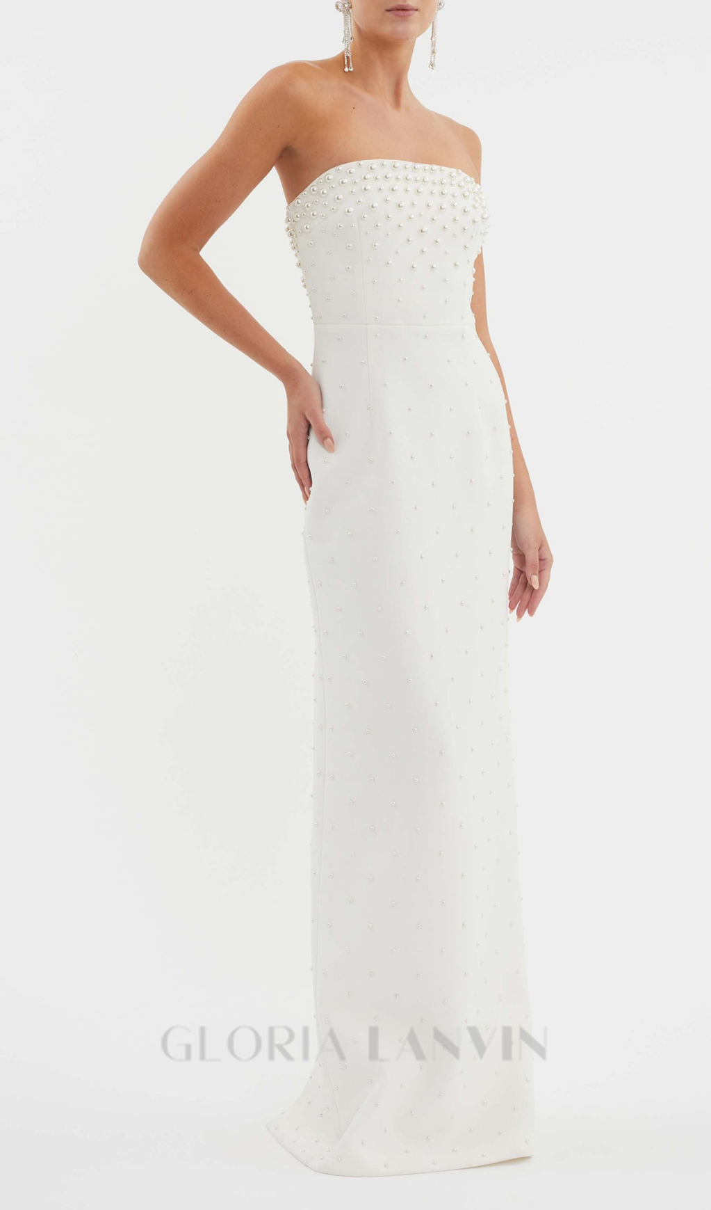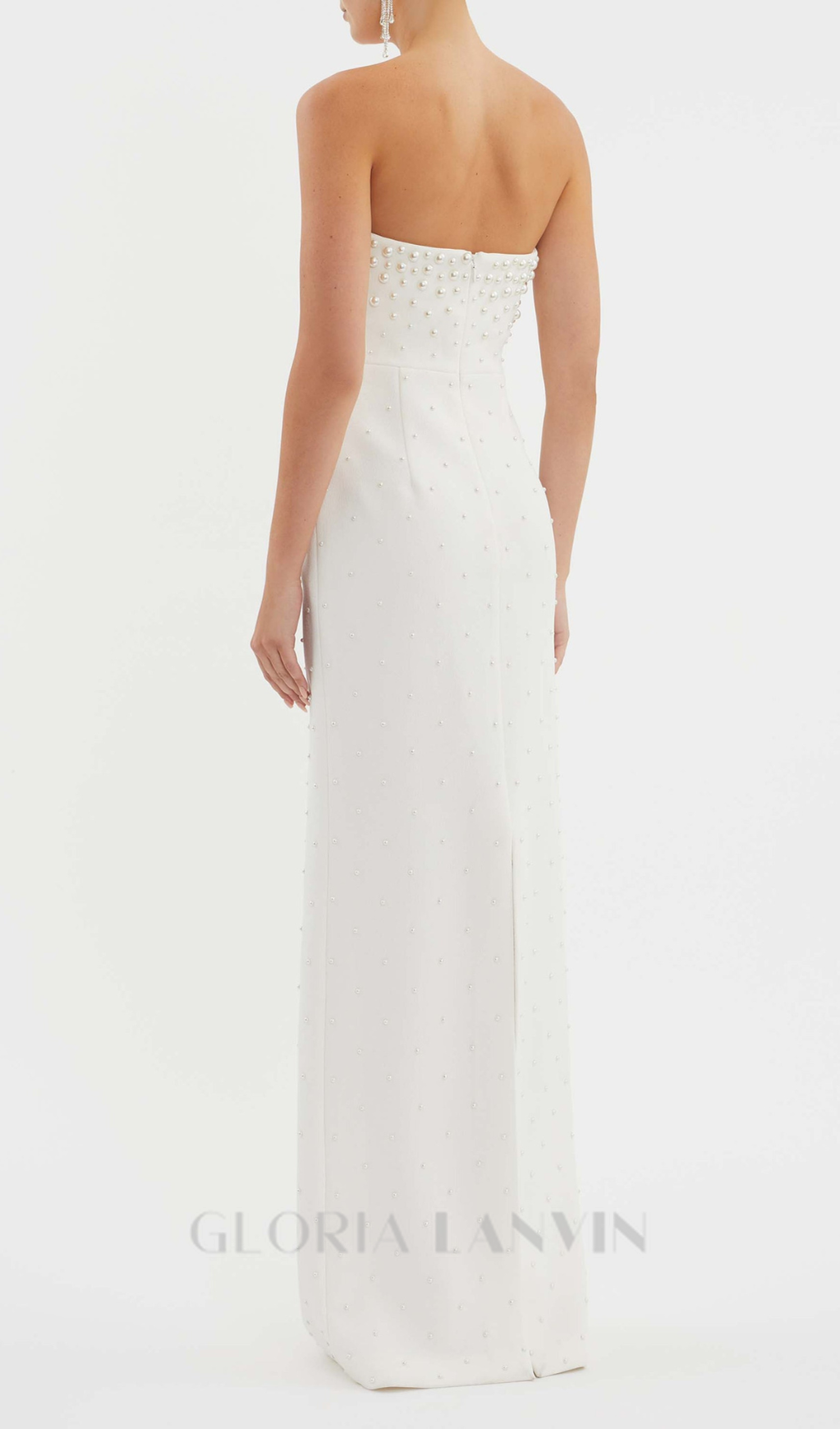 The elegant pearls add a touch of sophistication to the stunning strapless design. Perfect for any formal occasion, this gown is sure to make you feel confident and beautiful. Elevate your style with this breathtaking piece!