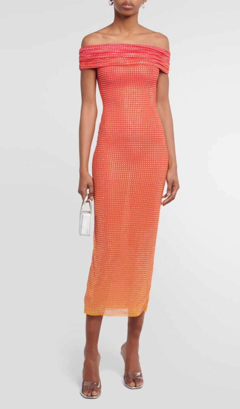Look chic and stay comfy in this pretty pink midi dress. The off-the-shoulder neckline is embellished with a glittery design that adds extra dazzle. It's the perfect pick for a night out with the girls! (That promise a night free of drama, of course!)