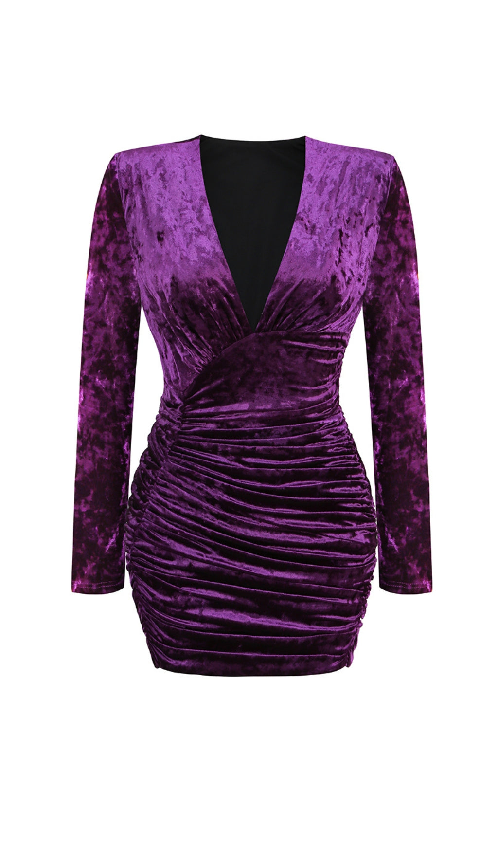 Look glamorous in this Purple V Neck Ruched Velvet Mini Dress. Luxurious velvet fabric and figure-flattering ruching make this a show-stopping look that will have all eyes on you! Turn heads in this must-have dress!