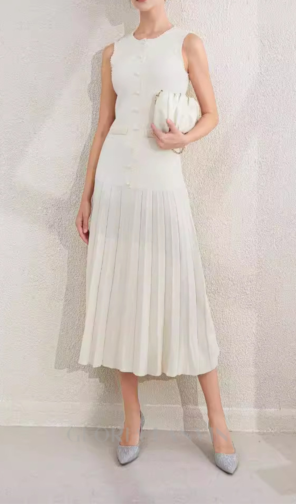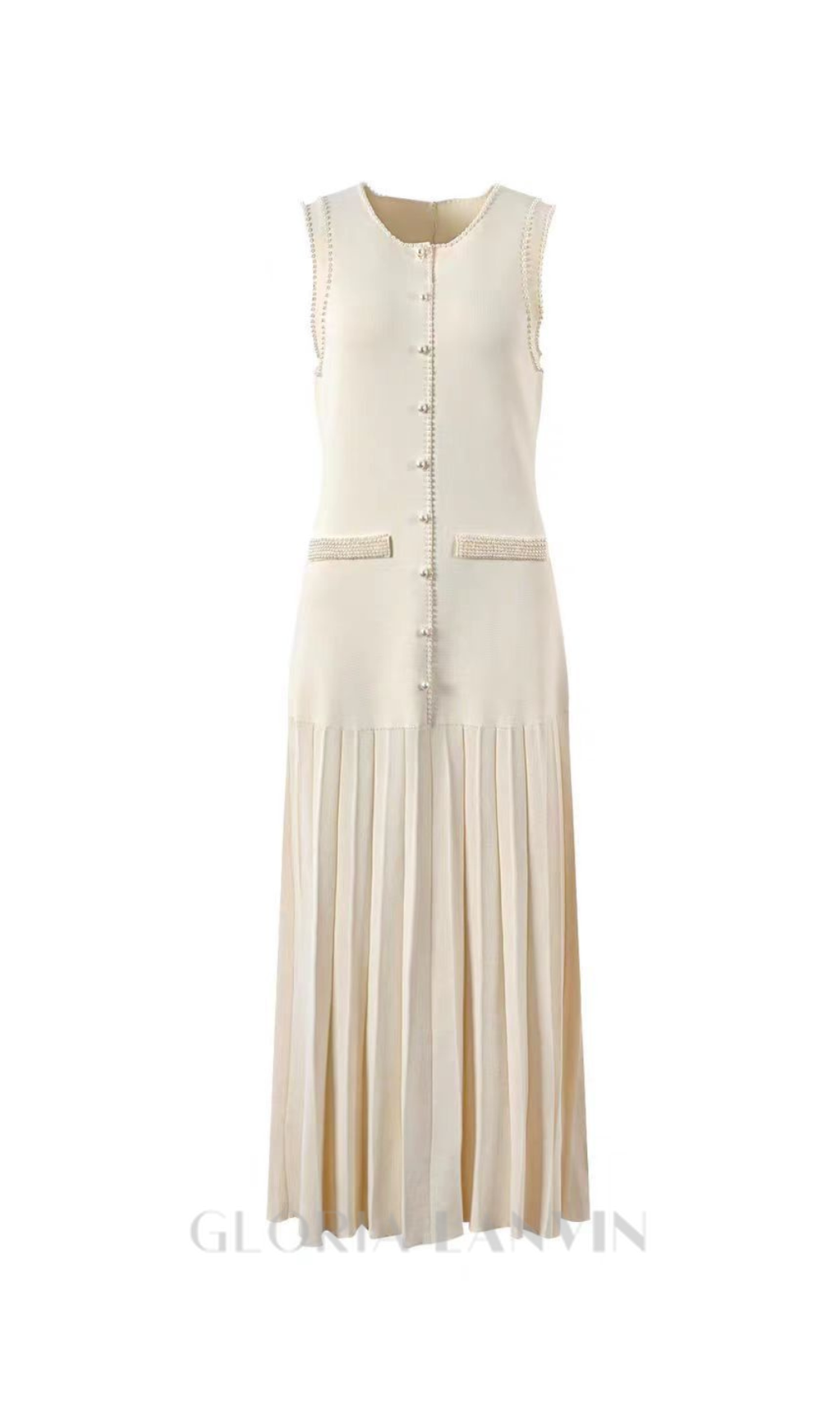 This dress features delicate beaded trim and a flattering sleeveless design, making it perfect for any occasion. The soft knit material ensures comfort while the apricot color adds a touch of femininity. Upgrade your wardrobe with this stunning midi dress!