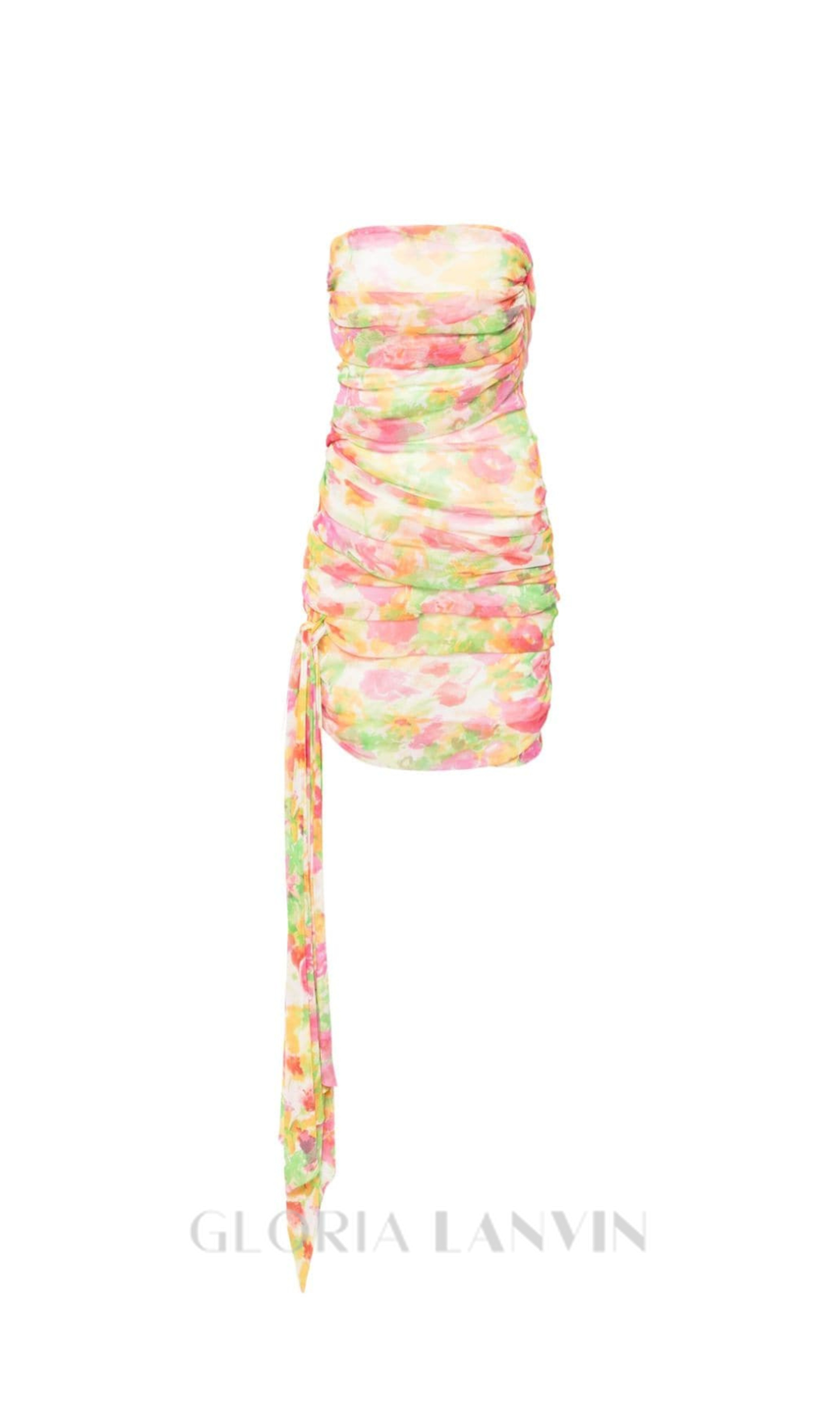 The strapless design and enchanting floral print add a touch of elegance, while the ruched details provide a flattering fit for any body type. Make a statement and turn heads at any event with this must-have dress!