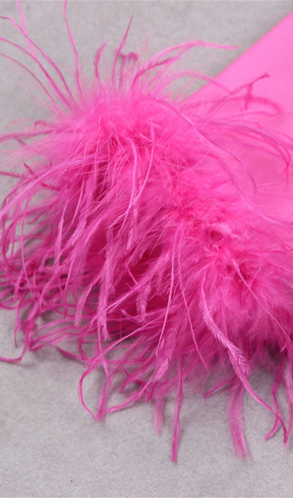 It's cut from soft stretch-jersey and structured with bound seams and zip fastenings through the back . it has a close fit with padded shoulders and a sweetheart neckline. sleeves inlaid with tonal Ostrich feathers. Wear yours with tonal accessories and mules.